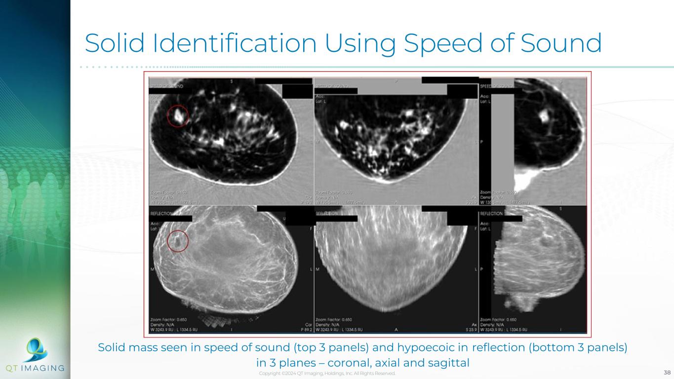 38 Solid Identification Using Speed of Sound Solid mass seen in speed of sound (top 3 panels) and hypoecoic in reflection (bottom 3 panels) in 3 planes – coronal, axial and sagittal Copyright ©2024 QT Imaging, Holdings, Inc. All Rights Reserved.