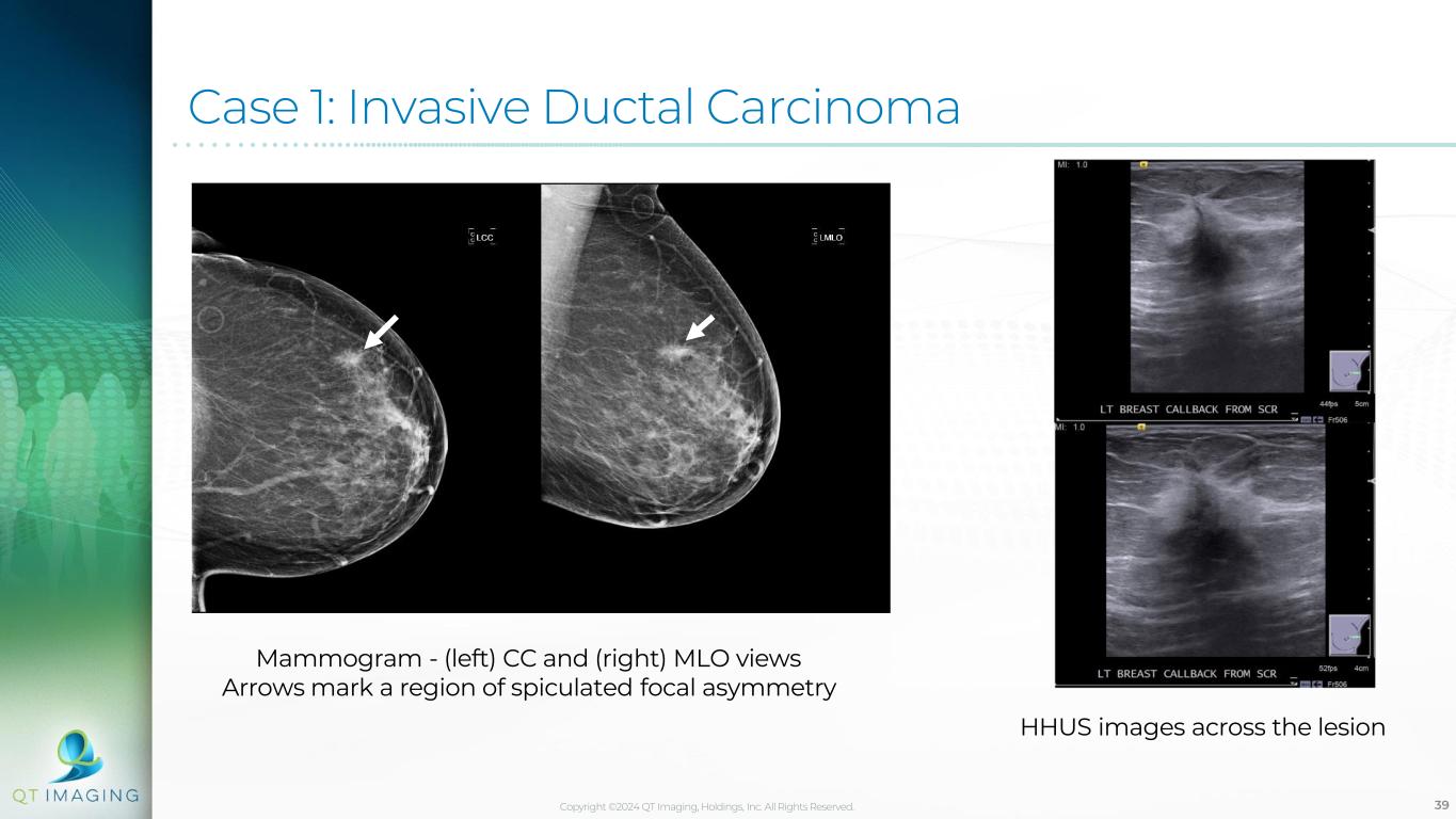 39 Case 1: Invasive Ductal Carcinoma Mammogram - (left) CC and (right) MLO views Arrows mark a region of spiculated focal asymmetry HHUS images across the lesion Copyright ©2024 QT Imaging, Holdings, Inc. All Rights Reserved.