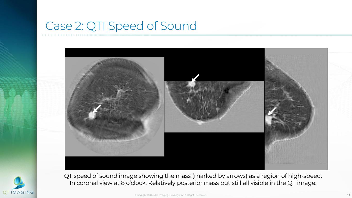 43 Case 2: QTI Speed of Sound QT speed of sound image showing the mass (marked by arrows) as a region of high-speed. In coronal view at 8 o’clock. Relatively posterior mass but still all visible in the QT image. Copyright ©2024 QT Imaging, Holdings, Inc. All Rights Reserved.