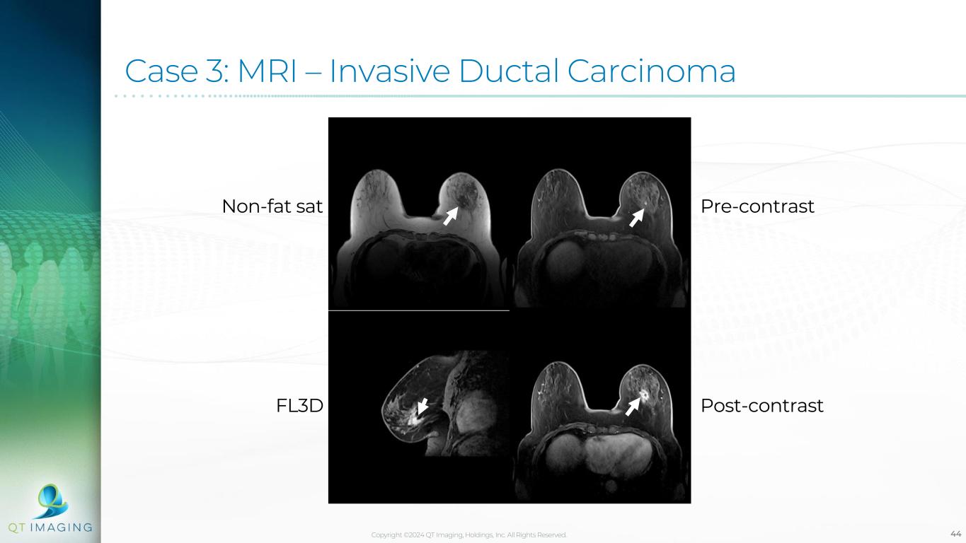 44 Case 3: MRI – Invasive Ductal Carcinoma Non-fat sat Pre-contrast Post-contrastFL3D Copyright ©2024 QT Imaging, Holdings, Inc. All Rights Reserved.