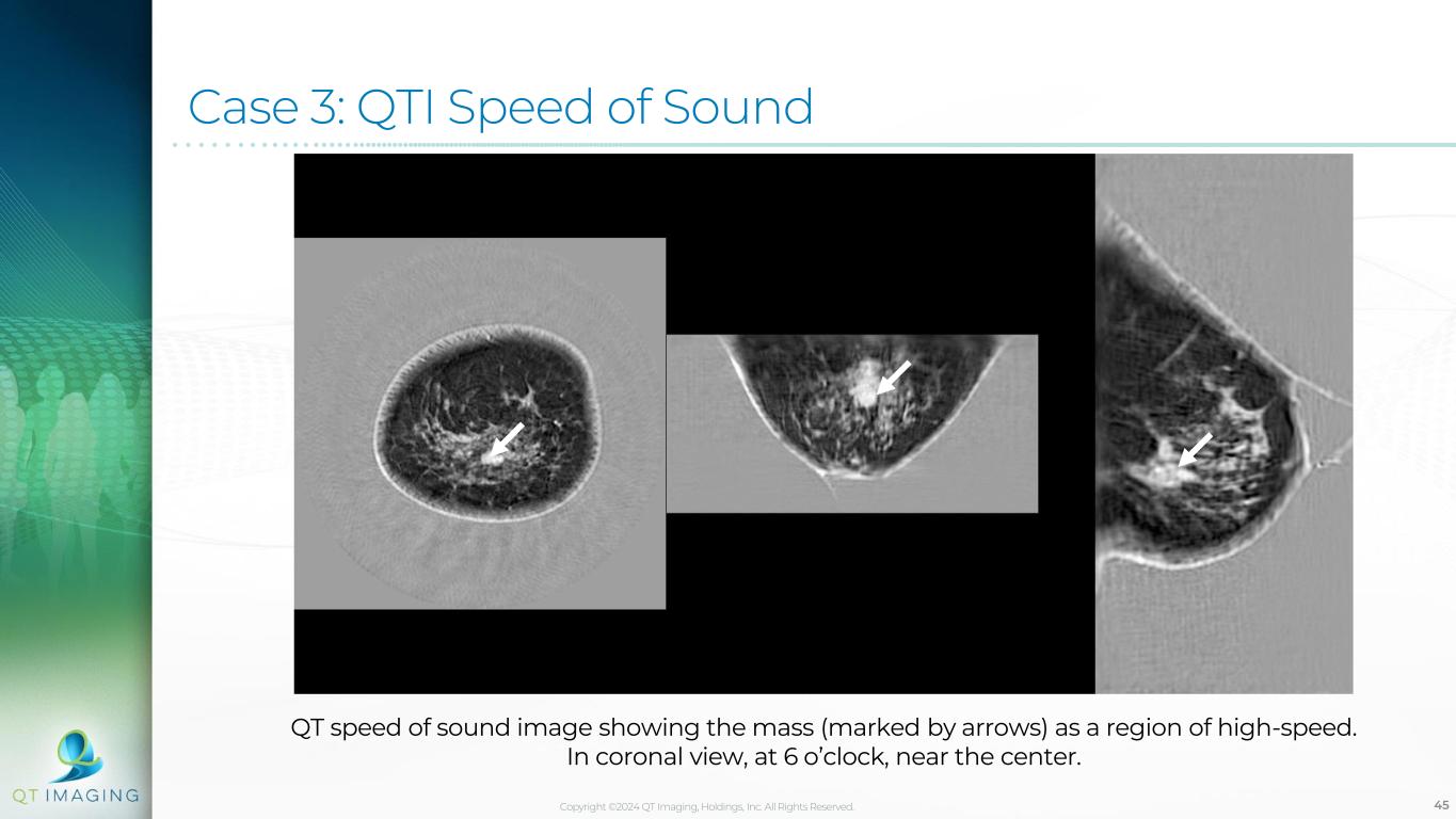 45 Case 3: QTI Speed of Sound QT speed of sound image showing the mass (marked by arrows) as a region of high-speed. In coronal view, at 6 o’clock, near the center. Copyright ©2024 QT Imaging, Holdings, Inc. All Rights Reserved.