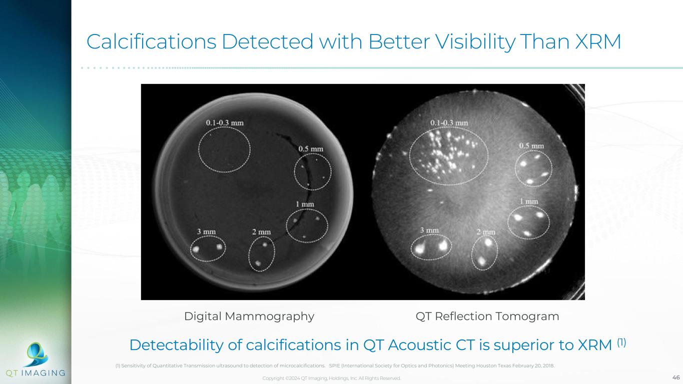 46 Calcifications Detected with Better Visibility Than XRM (1) Sensitivity of Quantitative Transmission ultrasound to detection of microcalcifications. SPIE (International Society for Optics and Photonics) Meeting Houston Texas February 20, 2018. Digital Mammography QT Reflection Tomogram Detectability of calcifications in QT Acoustic CT is superior to XRM (1) Copyright ©2024 QT Imaging, Holdings, Inc. All Rights Reserved.