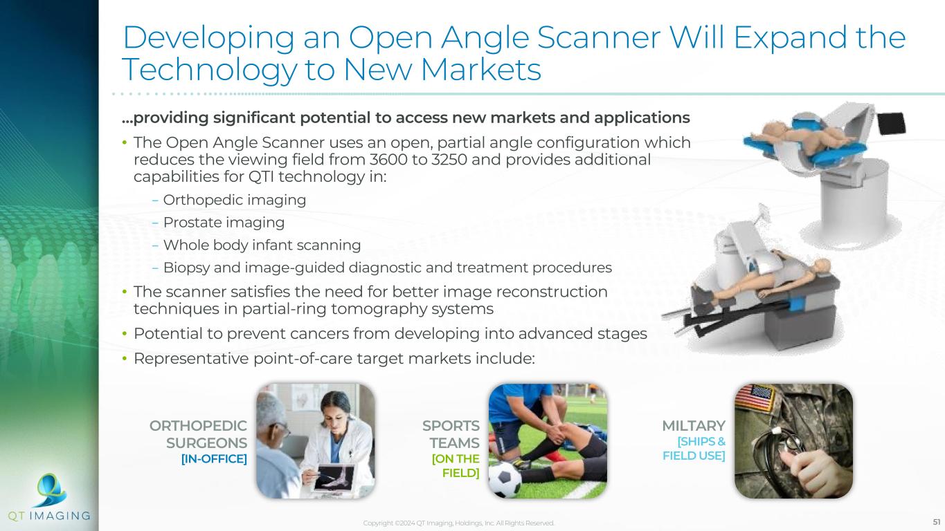 51 Developing an Open Angle Scanner Will Expand the Technology to New Markets …providing significant potential to access new markets and applications • The Open Angle Scanner uses an open, partial angle configuration which reduces the viewing field from 3600 to 3250 and provides additional capabilities for QTI technology in: − Orthopedic imaging − Prostate imaging − Whole body infant scanning − Biopsy and image-guided diagnostic and treatment procedures • The scanner satisfies the need for better image reconstruction techniques in partial-ring tomography systems • Potential to prevent cancers from developing into advanced stages • Representative point-of-care target markets include: ORTHOPEDIC SURGEONS [IN-OFFICE] SPORTS TEAMS [ON THE FIELD] MILTARY [SHIPS & FIELD USE] Copyright ©2024 QT Imaging, Holdings, Inc. All Rights Reserved.