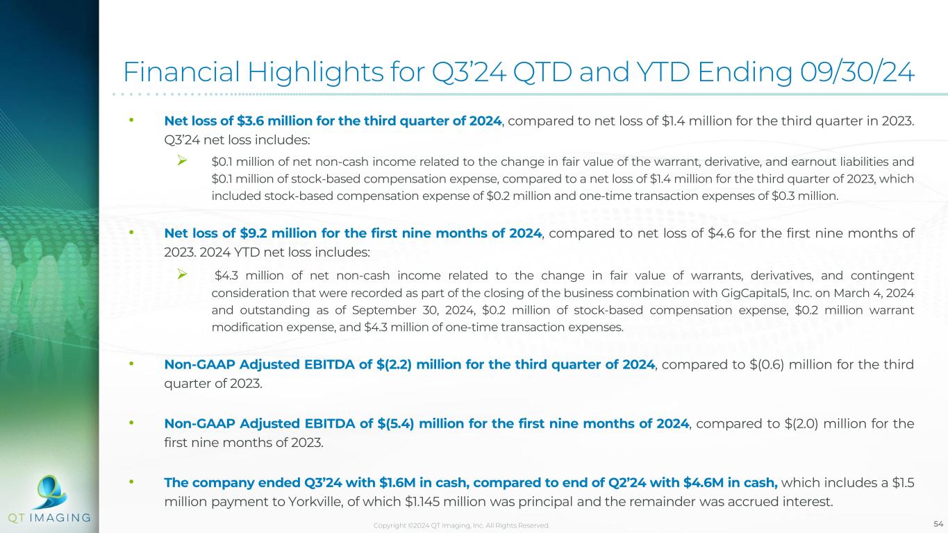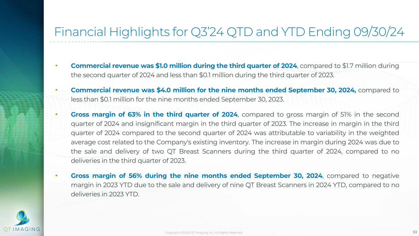 53Copyright ©2024 QT Imaging, Inc. All Rights Reserved. Financial Highlights for Q3’24 QTD and YTD Ending 09/30/24 • Commercial revenue was $1.0 million during the third quarter of 2024, compared to $1.7 million during the second quarter of 2024 and less than $0.1 million during the third quarter of 2023. • Commercial revenue was $4.0 million for the nine months ended September 30, 2024, compared to less than $0.1 million for the nine months ended September 30, 2023. • Gross margin of 63% in the third quarter of 2024, compared to gross margin of 51% in the second quarter of 2024 and insignificant margin in the third quarter of 2023. The increase in margin in the third quarter of 2024 compared to the second quarter of 2024 was attributable to variability in the weighted average cost related to the Company's existing inventory. The increase in margin during 2024 was due to the sale and delivery of two QT Breast Scanners during the third quarter of 2024, compared to no deliveries in the third quarter of 2023. • Gross margin of 56% during the nine months ended September 30, 2024, compared to negative margin in 2023 YTD due to the sale and delivery of nine QT Breast Scanners in 2024 YTD, compared to no deliveries in 2023 YTD.