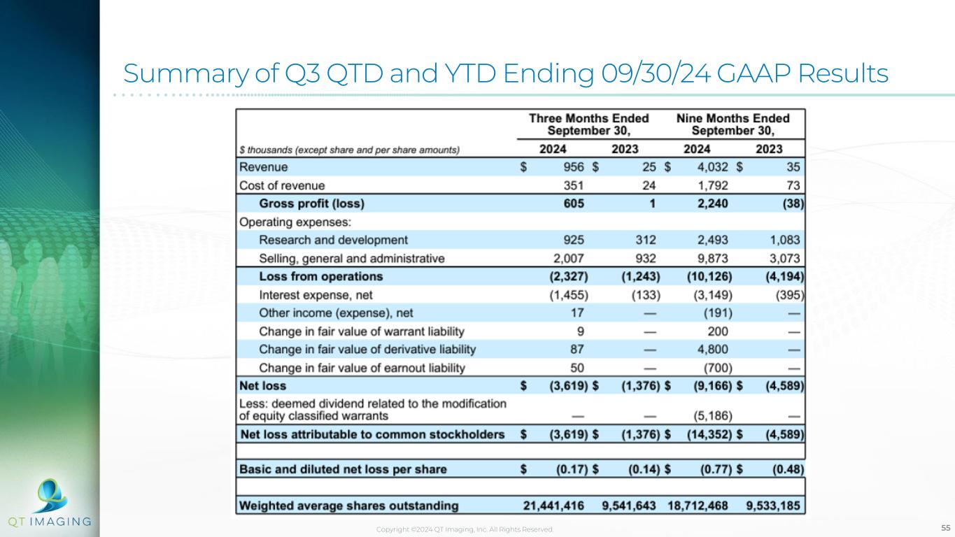 54Copyright ©2024 QT Imaging, Inc. All Rights Reserved. Financial Highlights for Q3’24 QTD and YTD Ending 09/30/24 • Net loss of $3.6 million for the third quarter of 2024, compared to net loss of $1.4 million for the third quarter in 2023. Q3’24 net loss includes: ➢ $0.1 million of net non-cash income related to the change in fair value of the warrant, derivative, and earnout liabilities and $0.1 million of stock-based compensation expense, compared to a net loss of $1.4 million for the third quarter of 2023, which included stock-based compensation expense of $0.2 million and one-time transaction expenses of $0.3 million. • Net loss of $9.2 million for the first nine months of 2024, compared to net loss of $4.6 for the first nine months of 2023. 2024 YTD net loss includes: ➢ $4.3 million of net non-cash income related to the change in fair value of warrants, derivatives, and contingent consideration that were recorded as part of the closing of the business combination with GigCapital5, Inc. on March 4, 2024 and outstanding as of September 30, 2024, $0.2 million of stock-based compensation expense, $0.2 million warrant modification expense, and $4.3 million of one-time transaction expenses. • Non-GAAP Adjusted EBITDA of $(2.2) million for the third quarter of 2024, compared to $(0.6) million for the third quarter of 2023. • Non-GAAP Adjusted EBITDA of $(5.4) million for the first nine months of 2024, compared to $(2.0) million for the first nine months of 2023. • The company ended Q3’24 with $1.6M in cash, compared to end of Q2’24 with $4.6M in cash, which includes a $1.5 million payment to Yorkville, of which $1.145 million was principal and the remainder was accrued interest.