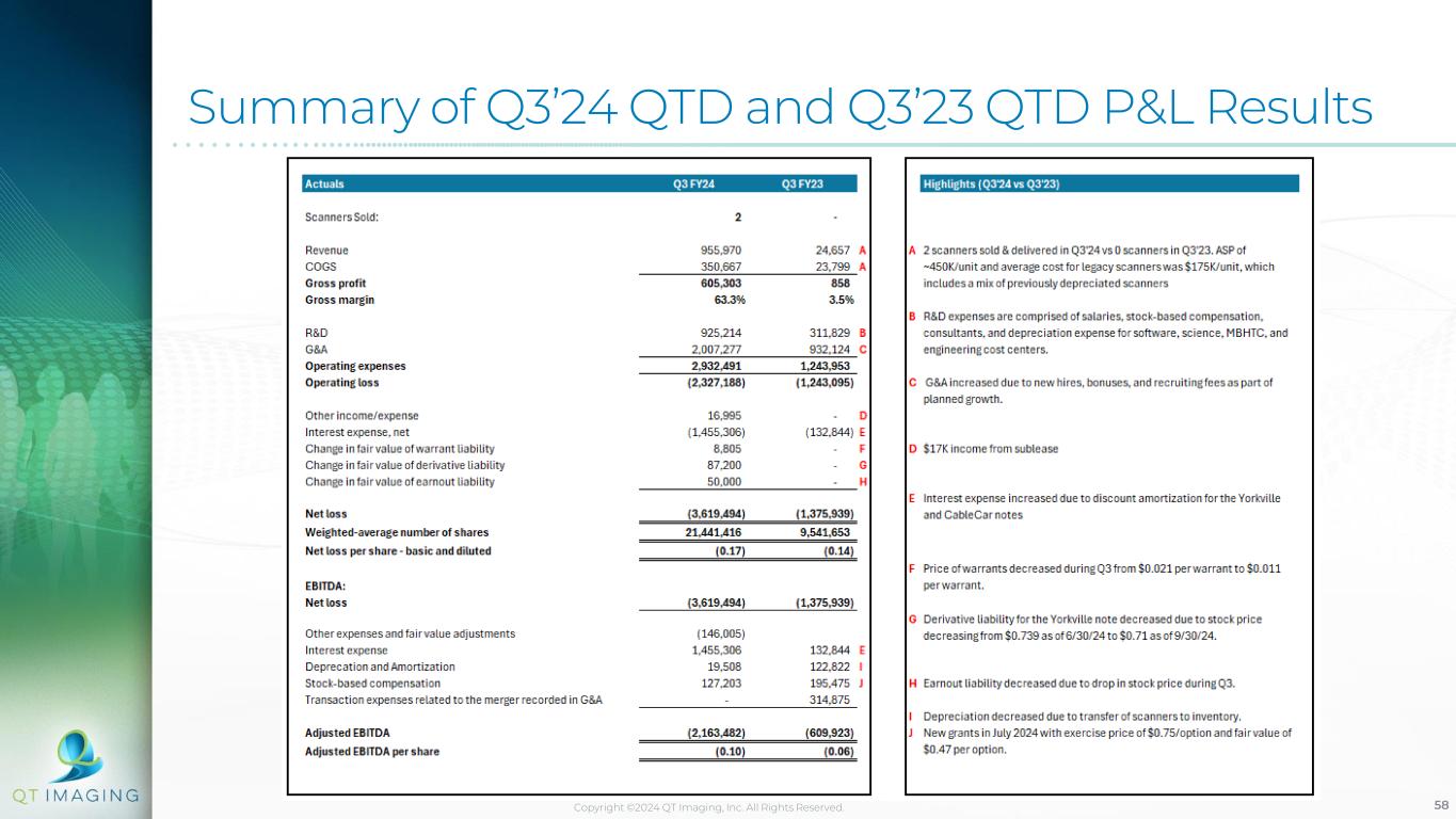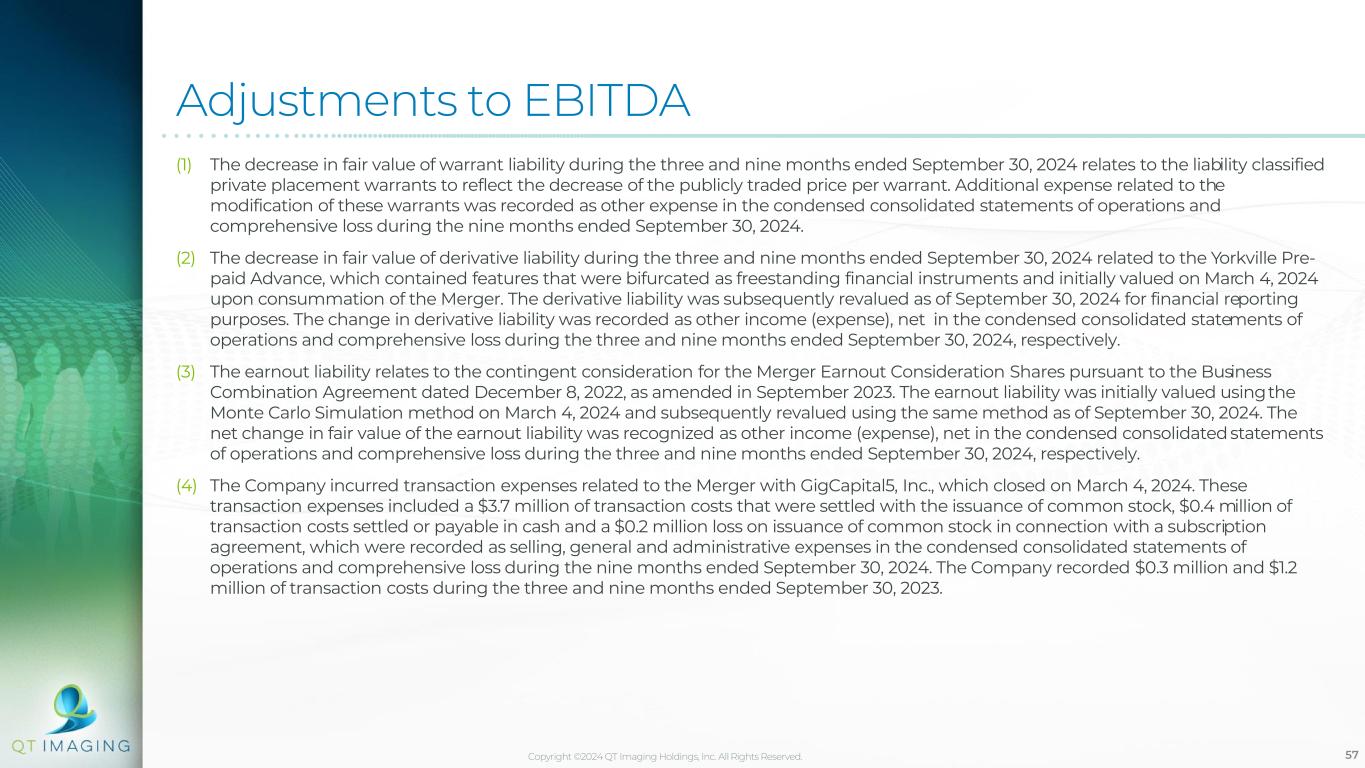 57 Adjustments to EBITDA (1) The decrease in fair value of warrant liability during the three and nine months ended September 30, 2024 relates to the liability classified private placement warrants to reflect the decrease of the publicly traded price per warrant. Additional expense related to the modification of these warrants was recorded as other expense in the condensed consolidated statements of operations and comprehensive loss during the nine months ended September 30, 2024. (2) The decrease in fair value of derivative liability during the three and nine months ended September 30, 2024 related to the Yorkville Pre- paid Advance, which contained features that were bifurcated as freestanding financial instruments and initially valued on March 4, 2024 upon consummation of the Merger. The derivative liability was subsequently revalued as of September 30, 2024 for financial reporting purposes. The change in derivative liability was recorded as other income (expense), net in the condensed consolidated statements of operations and comprehensive loss during the three and nine months ended September 30, 2024, respectively. (3) The earnout liability relates to the contingent consideration for the Merger Earnout Consideration Shares pursuant to the Business Combination Agreement dated December 8, 2022, as amended in September 2023. The earnout liability was initially valued using the Monte Carlo Simulation method on March 4, 2024 and subsequently revalued using the same method as of September 30, 2024. The net change in fair value of the earnout liability was recognized as other income (expense), net in the condensed consolidated statements of operations and comprehensive loss during the three and nine months ended September 30, 2024, respectively. (4) The Company incurred transaction expenses related to the Merger with GigCapital5, Inc., which closed on March 4, 2024. These transaction expenses included a $3.7 million of transaction costs that were settled with the issuance of common stock, $0.4 million of transaction costs settled or payable in cash and a $0.2 million loss on issuance of common stock in connection with a subscription agreement, which were recorded as selling, general and administrative expenses in the condensed consolidated statements of operations and comprehensive loss during the nine months ended September 30, 2024. The Company recorded $0.3 million and $1.2 million of transaction costs during the three and nine months ended September 30, 2023. Copyright ©2024 QT Imaging Holdings, Inc. All Rights Reserved.