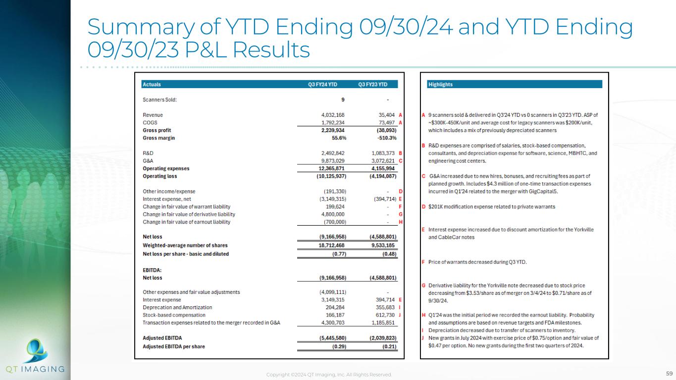58Copyright ©2024 QT Imaging, Inc. All Rights Reserved. Summary of Q3’24 QTD and Q3’23 QTD P&L Results