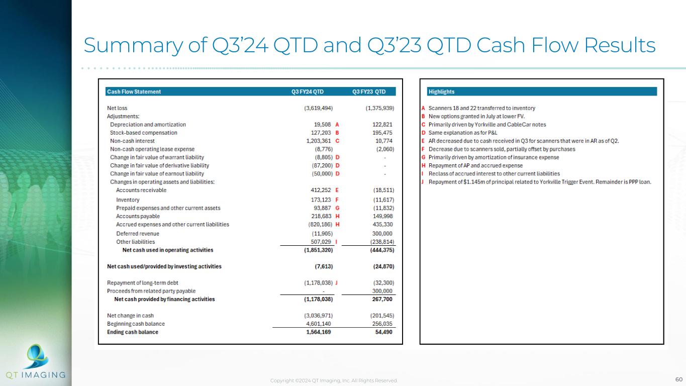 61Copyright ©2024 QT Imaging, Inc. All Rights Reserved. Summary of YTD Ending 09/30/24 and YTD Ending 09/30/23 Cash Flow Results