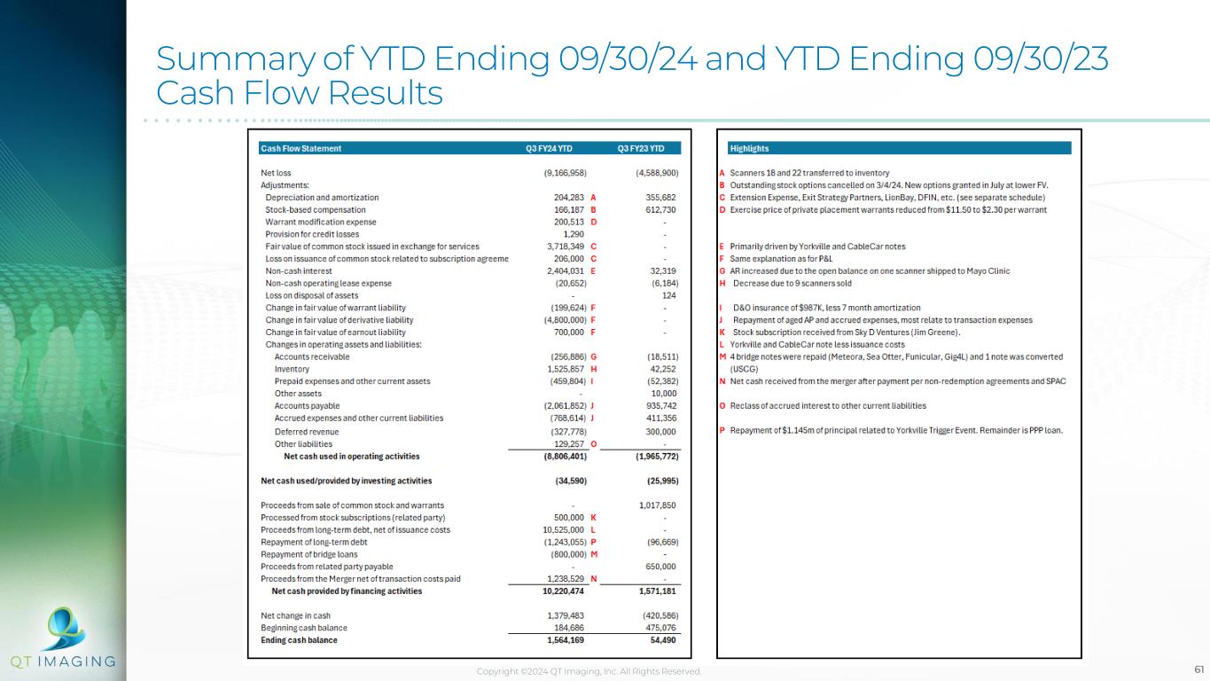 60Copyright ©2024 QT Imaging, Inc. All Rights Reserved. Summary of Q3’24 QTD and Q3’23 QTD Cash Flow Results