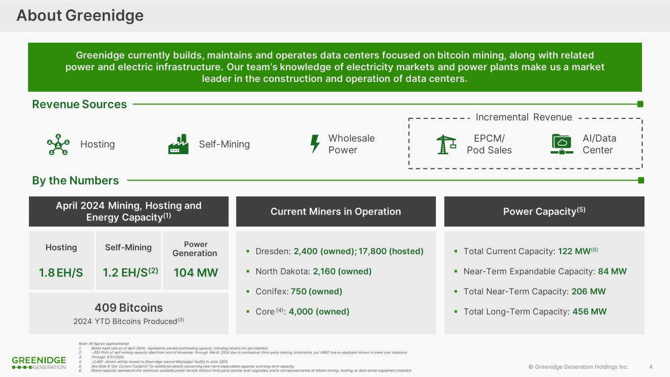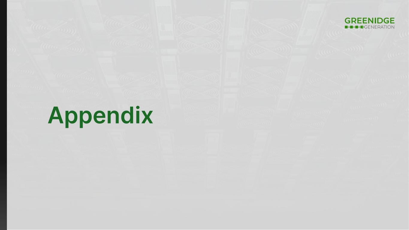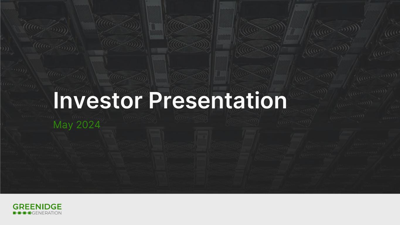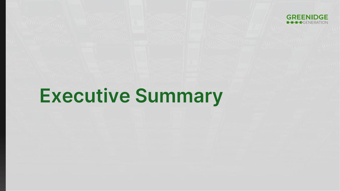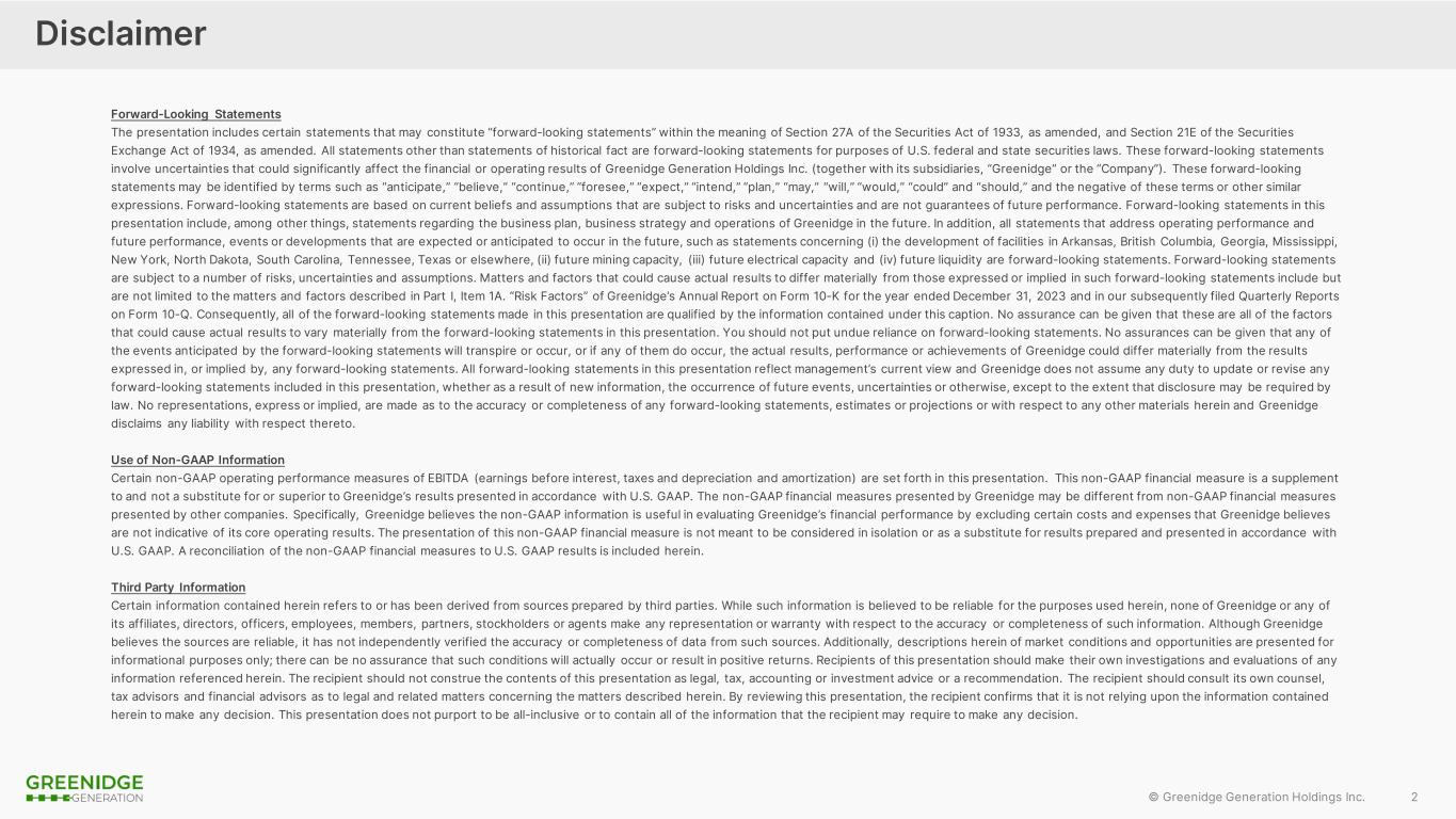 Disclaimer Forward-Looking Statements The presentation includes certain statements that may constitute “forward-looking statements” within the meaning of Section 27A of the Securities Act of 1933, as amended, and Section 21E of the Securities Exchange Act of 1934, as amended. All statements other than statements of historical fact are forward-looking statements for purposes of U.S. federal and state securities laws. These forward-looking statements involve uncertainties that could significantly affect the financial or operating results of Greenidge Generation Holdings Inc. (together with its subsidiaries, “Greenidge” or the “Company”). These forward-looking statements may be identified by terms such as “anticipate,” “believe,” “continue,” “foresee,” “expect,” “intend,” “plan,” “may,” “will,” “would,” “could” and “should,” and the negative of these terms or other similar expressions. Forward-looking statements are based on current beliefs and assumptions that are subject to risks and uncertainties and are not guarantees of future performance. Forward-looking statements in this presentation include, among other things, statements regarding the business plan, business strategy and operations of Greenidge in the future. In addition, all statements that address operating performance and future performance, events or developments that are expected or anticipated to occur in the future, such as statements concerning (i) the development of facilities in Arkansas, British Columbia, Georgia, Mississippi, New York, North Dakota, South Carolina, Tennessee, Texas or elsewhere, (ii) future mining capacity, (iii) future electrical capacity and (iv) future liquidity are forward-looking statements. Forward-looking statements are subject to a number of risks, uncertainties and assumptions. Matters and factors that could cause actual results to differ materially from those expressed or implied in such forward-looking statements include but are not limited to the matters and factors described in Part I, Item 1A. “Risk Factors” of Greenidge’s Annual Report on Form 10-K for the year ended December 31, 2023 and in our subsequently filed Quarterly Reports on Form 10-Q. Consequently, all of the forward-looking statements made in this presentation are qualified by the information contained under this caption. No assurance can be given that these are all of the factors that could cause actual results to vary materially from the forward-looking statements in this presentation. You should not put undue reliance on forward-looking statements. No assurances can be given that any of the events anticipated by the forward-looking statements will transpire or occur, or if any of them do occur, the actual results, performance or achievements of Greenidge could differ materially from the results expressed in, or implied by, any forward-looking statements. All forward-looking statements in this presentation reflect management’s current view and Greenidge does not assume any duty to update or revise any forward-looking statements included in this presentation, whether as a result of new information, the occurrence of future events, uncertainties or otherwise, except to the extent that disclosure may be required by law. No representations, express or implied, are made as to the accuracy or completeness of any forward-looking statements, estimates or projections or with respect to any other materials herein and Greenidge disclaims any liability with respect thereto. Use of Non-GAAP Information Certain non-GAAP operating performance measures of EBITDA (earnings before interest, taxes and depreciation and amortization) are set forth in this presentation. This non-GAAP financial measure is a supplement to and not a substitute for or superior to Greenidge’s results presented in accordance with U.S. GAAP. The non-GAAP financial measures presented by Greenidge may be different from non-GAAP financial measures presented by other companies. Specifically, Greenidge believes the non-GAAP information is useful in evaluating Greenidge’s financial performance by excluding certain costs and expenses that Greenidge believes are not indicative of its core operating results. The presentation of this non-GAAP financial measure is not meant to be considered in isolation or as a substitute for results prepared and presented in accordance with U.S. GAAP. A reconciliation of the non-GAAP financial measures to U.S. GAAP results is included herein. Third Party Information Certain information contained herein refers to or has been derived from sources prepared by third parties. While such information is believed to be reliable for the purposes used herein, none of Greenidge or any of its affiliates, directors, officers, employees, members, partners, stockholders or agents make any representation or warranty with respect to the accuracy or completeness of such information. Although Greenidge believes the sources are reliable, it has not independently verified the accuracy or completeness of data from such sources. Additionally, descriptions herein of market conditions and opportunities are presented for informational purposes only; there can be no assurance that such conditions will actually occur or result in positive returns. Recipients of this presentation should make their own investigations and evaluations of any information referenced herein. The recipient should not construe the contents of this presentation as legal, tax, accounting or investment advice or a recommendation. The recipient should consult its own counsel, tax advisors and financial advisors as to legal and related matters concerning the matters described herein. By reviewing this presentation, the recipient confirms that it is not relying upon the information contained herein to make any decision. This presentation does not purport to be all-inclusive or to contain all of the information that the recipient may 