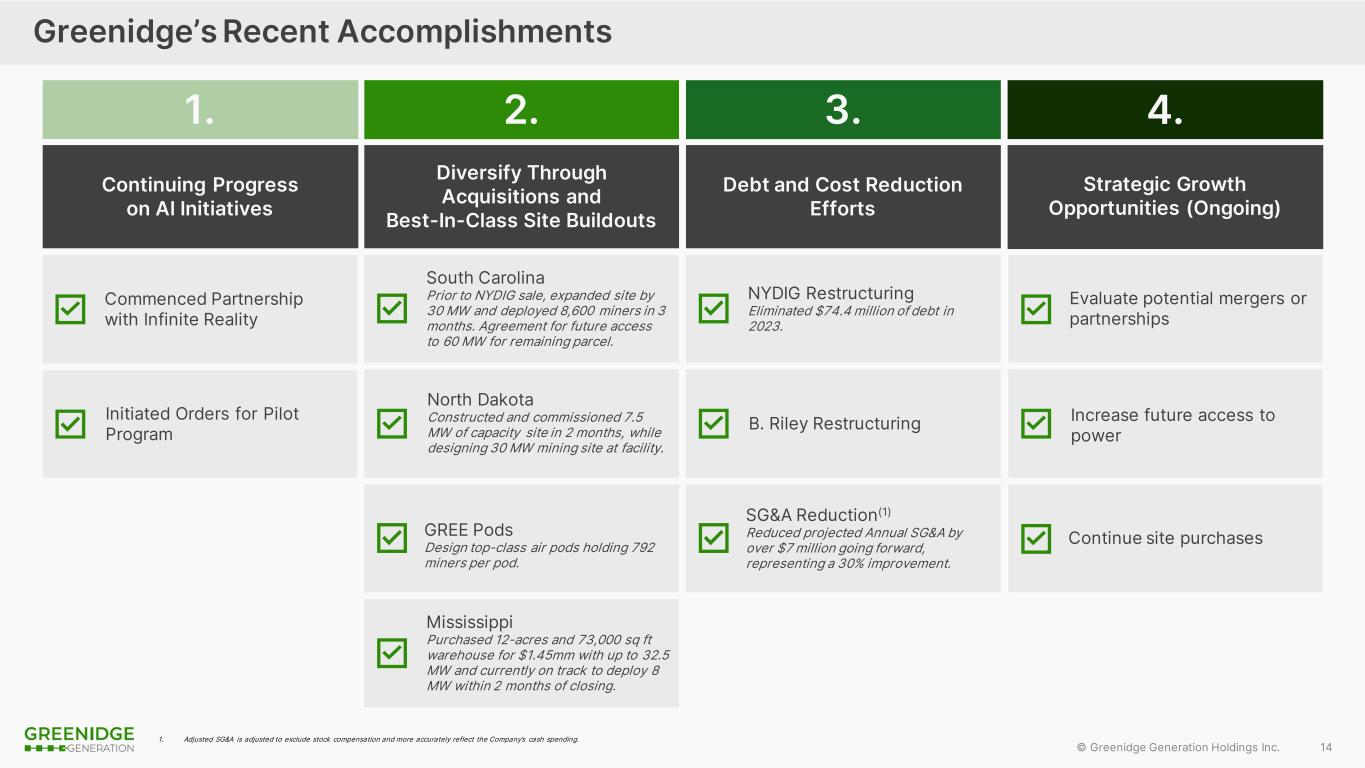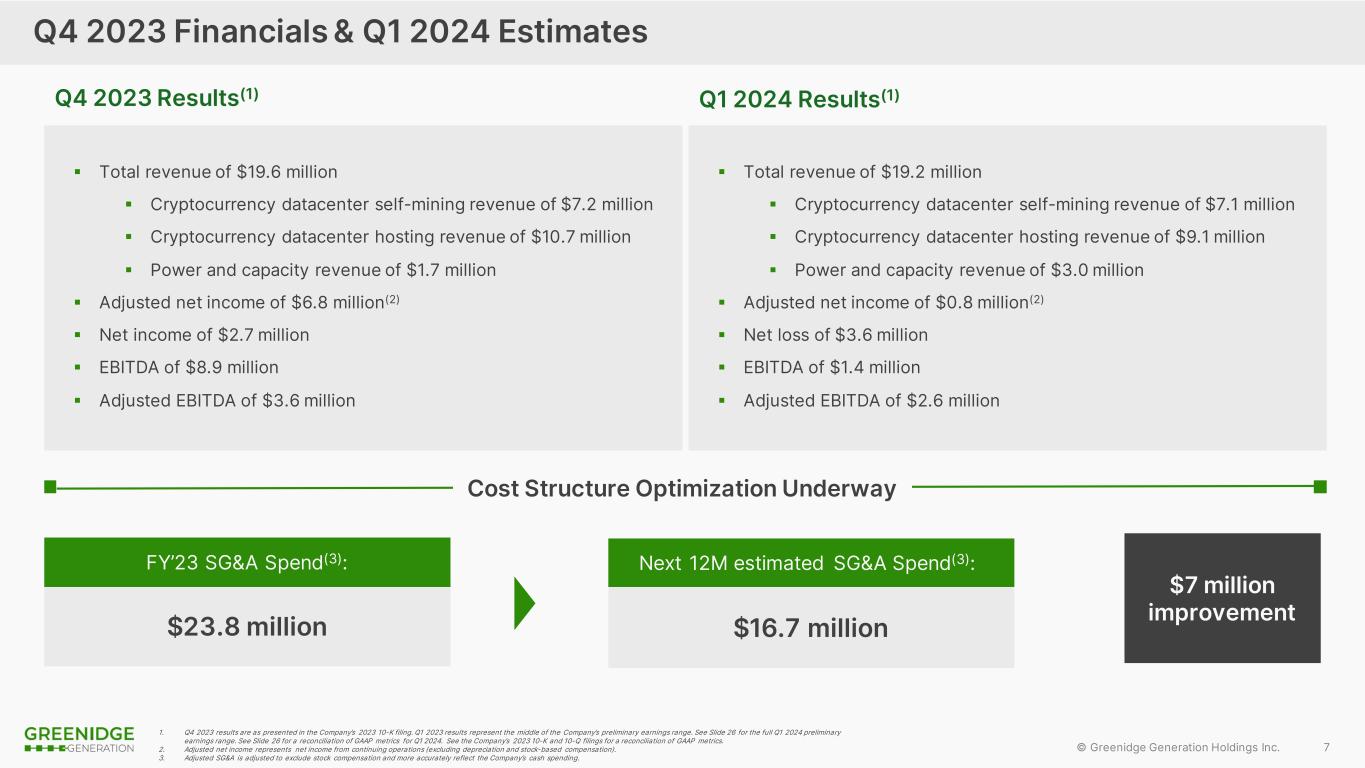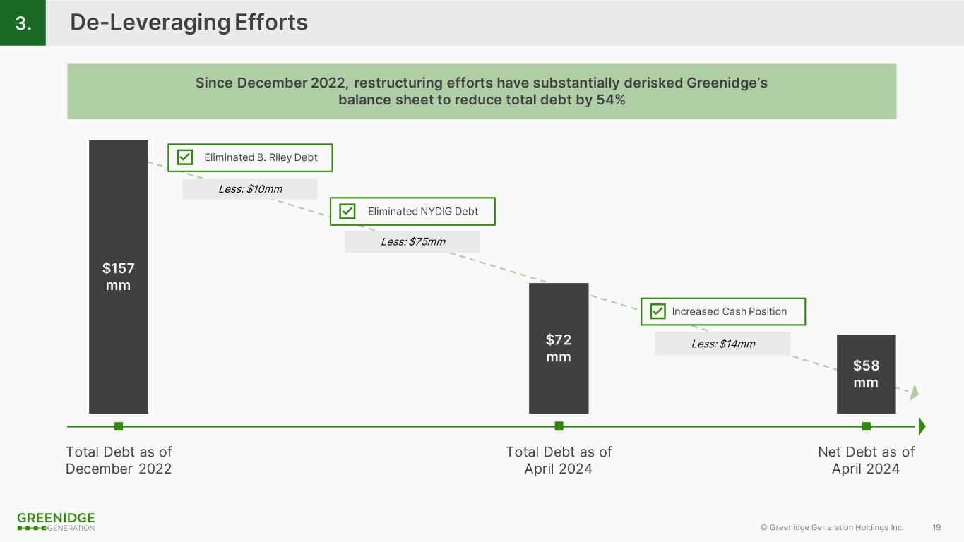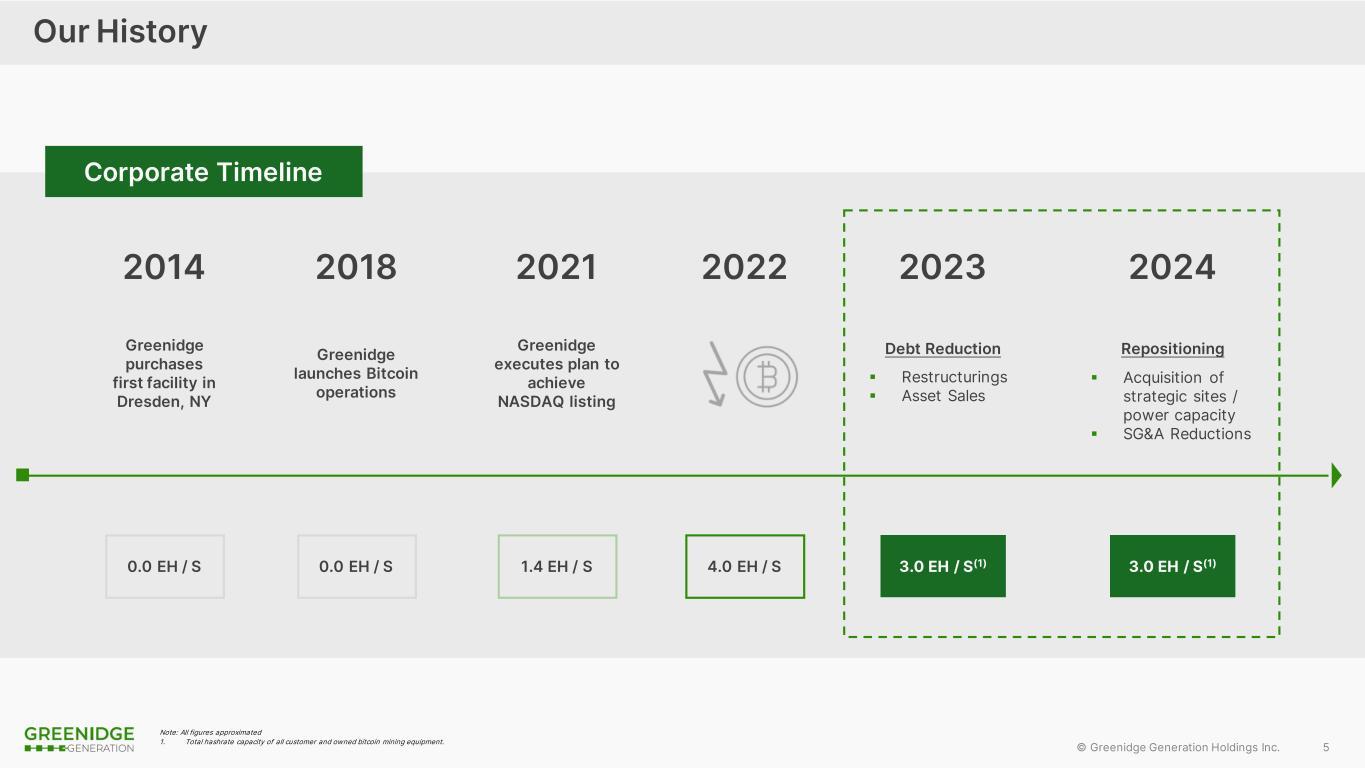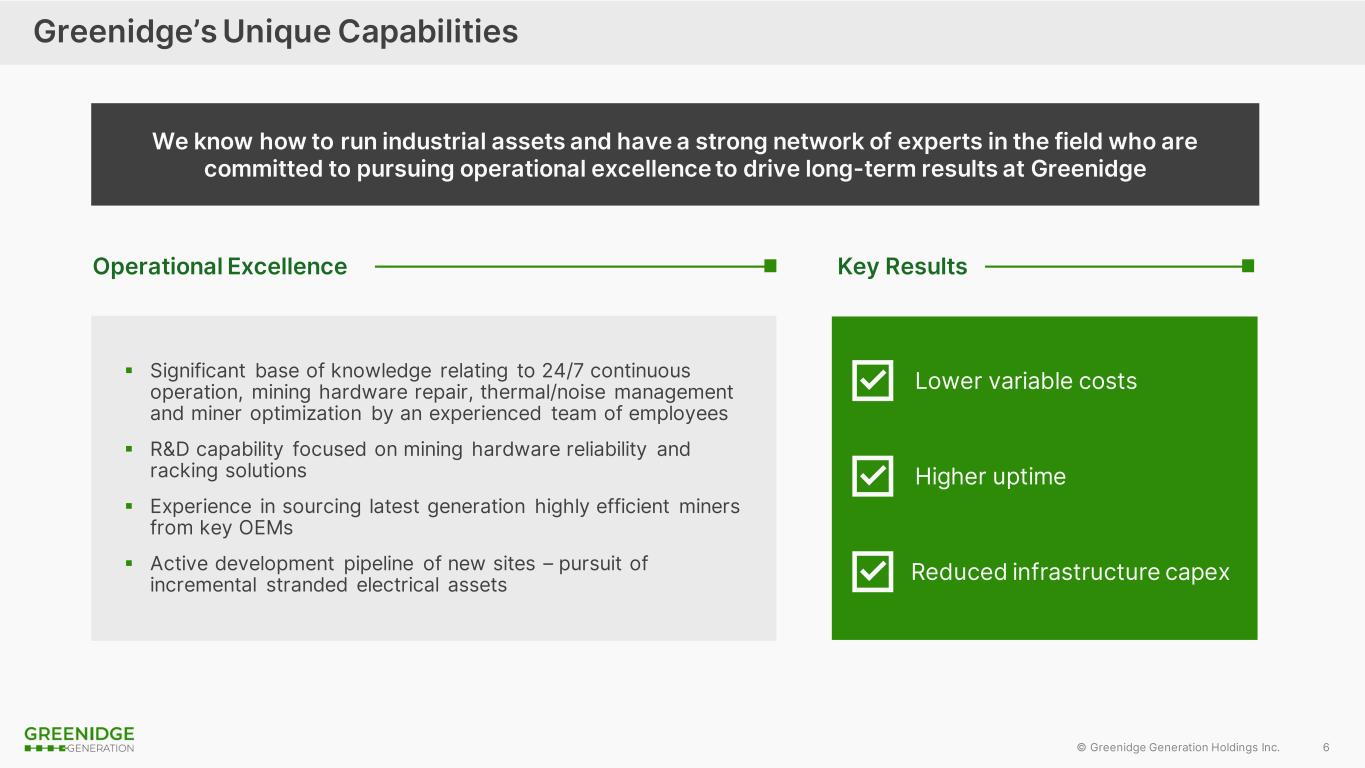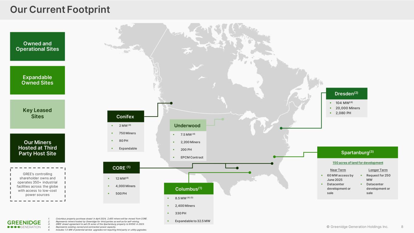 Disclaimer Forward-Looking Statements The presentation includes certain statements that may constitute “forward-looking statements” within the meaning of Section 27A of the Securities Act of 1933, as amended, and Section 21E of the Securities Exchange Act of 1934, as amended. All statements other than statements of historical fact are forward-looking statements for purposes of U.S. federal and state securities laws. These forward-looking statements involve uncertainties that could significantly affect the financial or operating results of Greenidge Generation Holdings Inc. (together with its subsidiaries, “Greenidge” or the “Company”). These forward-looking statements may be identified by terms such as “anticipate,” “believe,” “continue,” “foresee,” “expect,” “intend,” “plan,” “may,” “will,” “would,” “could” and “should,” and the negative of these terms or other similar expressions. Forward-looking statements are based on current beliefs and assumptions that are subject to risks and uncertainties and are not guarantees of future performance. Forward-looking statements in this presentation include, among other things, statements regarding the business plan, business strategy and operations of Greenidge in the future. In addition, all statements that address operating performance and future performance, events or developments that are expected or anticipated to occur in the future, such as statements concerning (i) the development of facilities in Arkansas, British Columbia, Georgia, Mississippi, New York, North Dakota, South Carolina, Tennessee, Texas or elsewhere, (ii) future mining capacity, (iii) future electrical capacity and (iv) future liquidity are forward-looking statements. Forward-looking statements are subject to a number of risks, uncertainties and assumptions. Matters and factors that could cause actual results to differ materially from those expressed or implied in such forward-looking statements include but are not limited to the matters and factors described in Part I, Item 1A. “Risk Factors” of Greenidge’s Annual Report on Form 10-K for the year ended December 31, 2023 and in our subsequently filed Quarterly Reports on Form 10-Q. Consequently, all of the forward-looking statements made in this presentation are qualified by the information contained under this caption. No assurance can be given that these are all of the factors that could cause actual results to vary materially from the forward-looking statements in this presentation. You should not put undue reliance on forward-looking statements. No assurances can be given that any of the events anticipated by the forward-looking statements will transpire or occur, or if any of them do occur, the actual results, performance or achievements of Greenidge could differ materially from the results expressed in, or implied by, any forward-looking statements. All forward-looking statements in this presentation reflect management’s current view and Greenidge does not assume any duty to update or revise any forward-looking statements included in this presentation, whether as a result of new information, the occurrence of future events, uncertainties or otherwise, except to the extent that disclosure may be required by law. No representations, express or implied, are made as to the accuracy or completeness of any forward-looking statements, estimates or projections or with respect to any other materials herein and Greenidge disclaims any liability with respect thereto. Use of Non-GAAP Information Certain non-GAAP operating performance measures of EBITDA (earnings before interest, taxes and depreciation and amortization) are set forth in this presentation. This non-GAAP financial measure is a supplement to and not a substitute for or superior to Greenidge’s results presented in accordance with U.S. GAAP. The non-GAAP financial measures presented by Greenidge may be different from non-GAAP financial measures presented by other companies. Specifically, Greenidge believes the non-GAAP information is useful in evaluating Greenidge’s financial performance by excluding certain costs and expenses that Greenidge believes are not indicative of its core operating results. The presentation of this non-GAAP financial measure is not meant to be considered in isolation or as a substitute for results prepared and presented in accordance with U.S. GAAP. A reconciliation of the non-GAAP financial measures to U.S. GAAP results is included herein. Third Party Information Certain information contained herein refers to or has been derived from sources prepared by third parties. While such information is believed to be reliable for the purposes used herein, none of Greenidge or any of its affiliates, directors, officers, employees, members, partners, stockholders or agents make any representation or warranty with respect to the accuracy or completeness of such information. Although Greenidge believes the sources are reliable, it has not independently verified the accuracy or completeness of data from such sources. Additionally, descriptions herein of market conditions and opportunities are presented for informational purposes only; there can be no assurance that such conditions will actually occur or result in positive returns. Recipients of this presentation should make their own investigations and evaluations of any information referenced herein. The recipient should not construe the contents of this presentation as legal, tax, accounting or investment advice or a recommendation. The recipient should consult its own counsel, tax advisors and financial advisors as to legal and related matters concerning the matters described herein. By reviewing this presentation, the recipient confirms that it is not relying upon the information contained herein to make any decision. This presentation does not purport to be all-inclusive or to contain all of the information that the recipient may 
