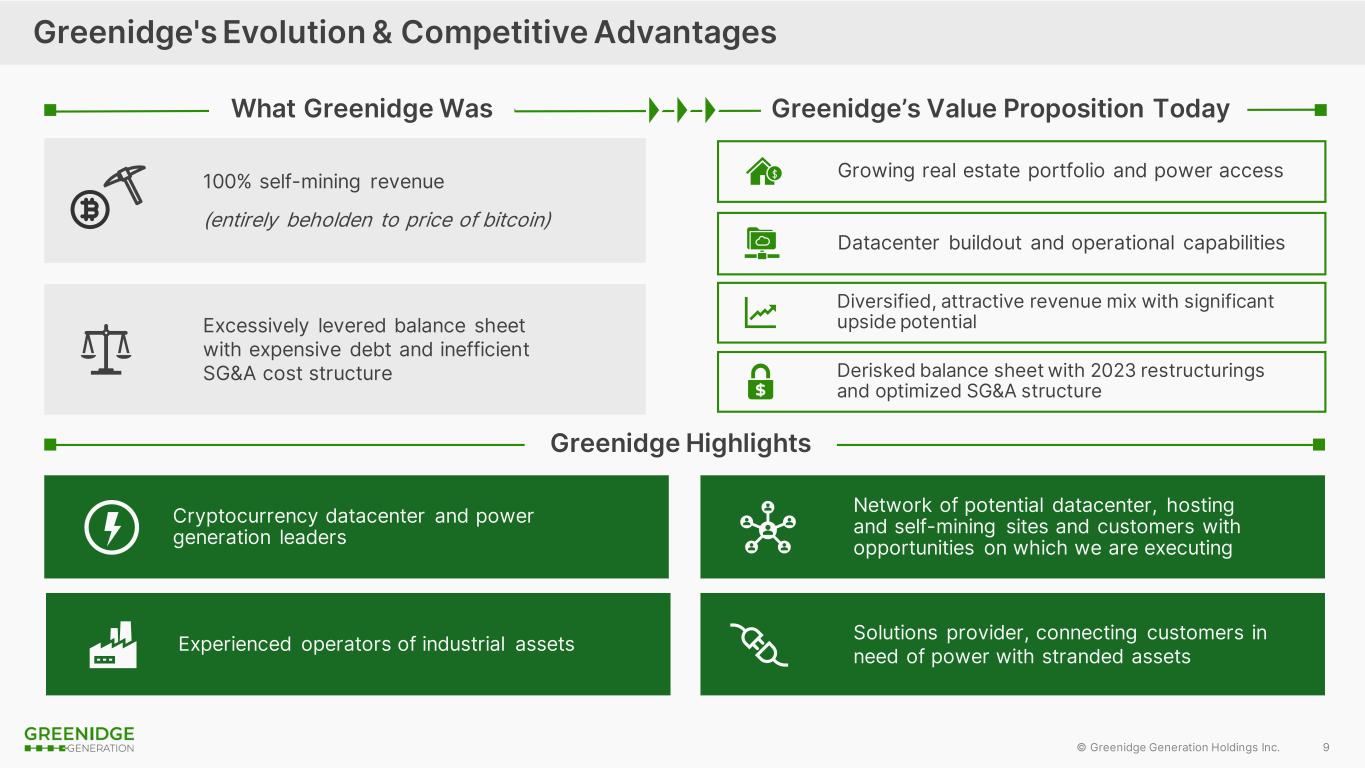 Our Current Footprint 8  8.5 MW (4) (5)  2,400 Miners  330 PH  Expandable to 32.5 MW Columbus(1)  2 MW (4)  750 Miners  80 PH  Expandable Conifex  12 MW(4)  4,000 Miners  500 PH CORE (1)  7.5 MW (4)  2,200 Miners  200 PH  EPCM Contract Underwood Dresden(2)  104 MW(4)  20,000 Miners  2,080 PH 1. Columbus property purchase closed in April 2024, 2,400 miners will be moved from CORE. 2. Represents miners hosted by Greenidge for third parties as well as for self-mining. 3. GREE closed agreement to sell 25 acres of the Spartanburg property to NYDIG in 2023. 4. Represents existing owned and contracted power capacity. 5. Includes 1.5 MW of potential service upgrades not requiring third party or utility upgrades. Spartanburg(3) Near Term  60 MW access by June 2025  Datacenter development or sale Longer Term  Request for 250 MW  Datacenter development or sale 150 acres of land for development © Greenidge Generation Holdings Inc. Owned and Operational Sites Our Miners Hosted at Third Party Host Site Expandable Owned Sites Key Leased Sites GREE’s controlling shareholder owns and operates 350+ industrial facilities across the globe with access to low-cost power sources