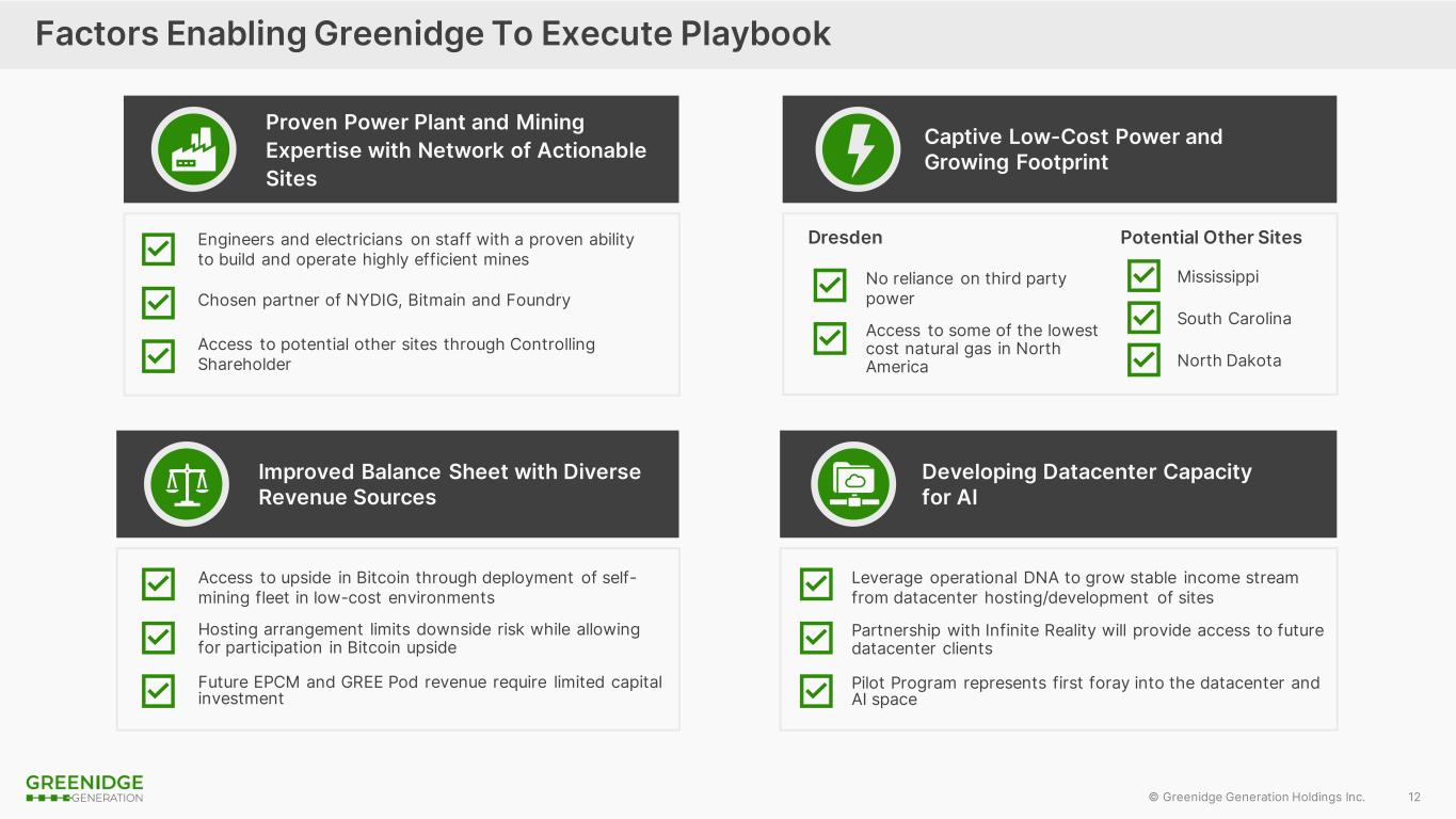 The New Greenidge Playbook for Value Creation 11 Find Sites with Current / Future Access to Significant Low-Cost Power Acquire Site Determine Best Use For Property and Maximize Power Capacity Option 2: Bitcoin MiningOption 1: GPU Datacenter for AI/HPC a) Add power infrastructure + build datacenter  sale or rent data center b) Add power infrastructure  sale with / without partners c) Immediate sale a) Hosting or Self-Mining b) Add power infrastructure  sale or rent property c) Immediate sale Spartanburg, SC: GPU Datacenter for AI / HPC Columbus, MS: Bitcoin Self-Mining and / or Hosting Execution of Playbook © Greenidge Generation Holdings Inc.