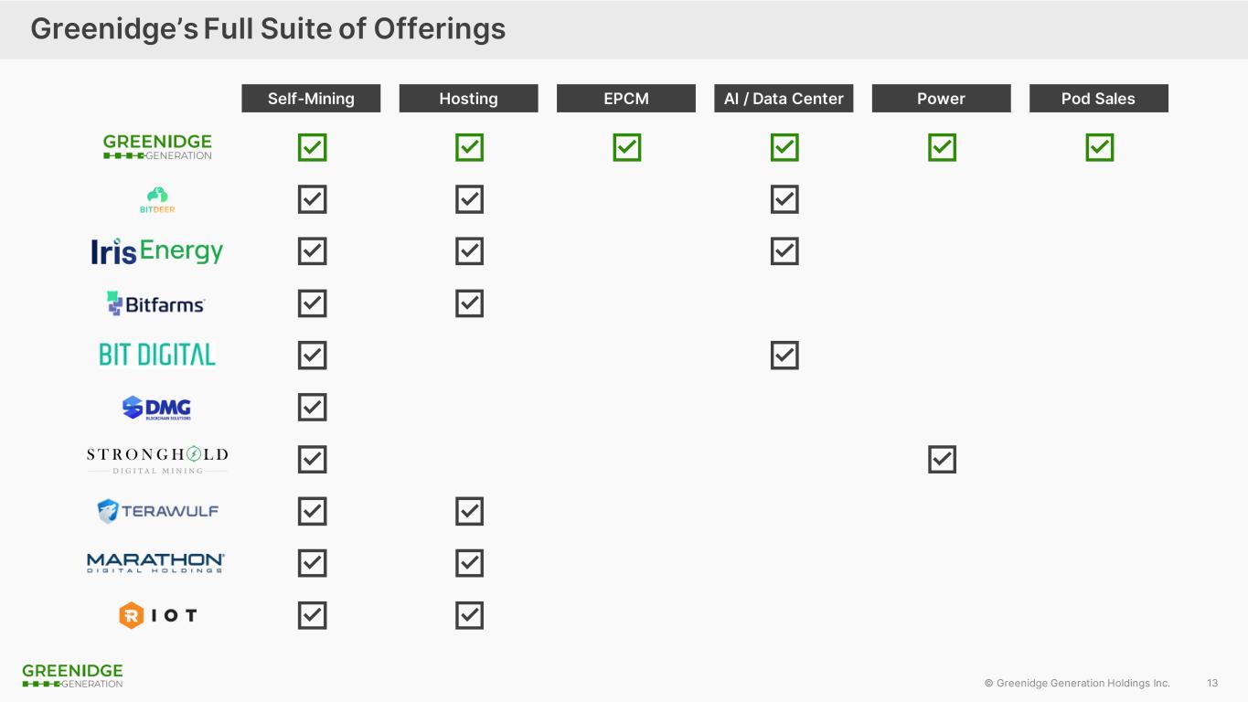 Factors Enabling Greenidge To Execute Playbook 12 No reliance on third party power Access to some of the lowest cost natural gas in North America Captive Low-Cost Power and Growing Footprint Dresden Potential Other SitesEngineers and electricians on staff with a proven ability to build and operate highly efficient mines Chosen partner of NYDIG, Bitmain and Foundry Proven Power Plant and Mining Expertise with Network of Actionable Sites Access to potential other sites through Controlling Shareholder A Leverage operational DNA to grow stable income stream from datacenter hosting/development of sites Partnership with Infinite Reality will provide access to future datacenter clients Pilot Program represents first foray into the datacenter and AI space Developing Datacenter Capacity for AI Access to upside in Bitcoin through deployment of self- mining fleet in low-cost environments Hosting arrangement limits downside risk while allowing for participation in Bitcoin upside Future EPCM and GREE Pod revenue require limited capital investment Improved Balance Sheet with Diverse Revenue Sources Mississippi South Carolina North Dakota © Greenidge Generation Holdings Inc.