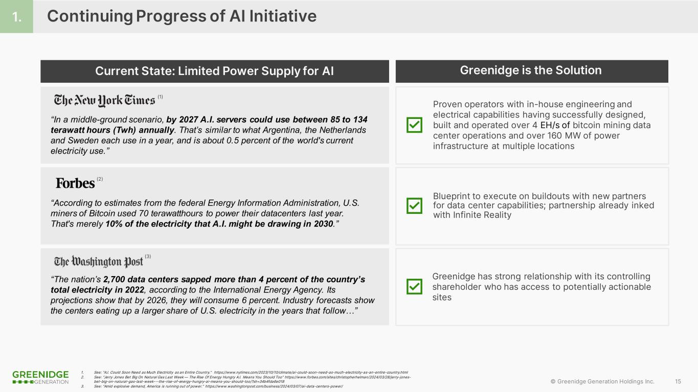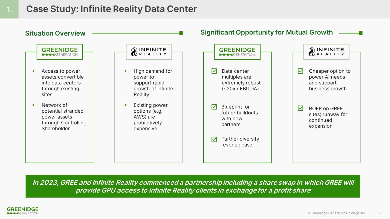 15 1. Continuing Progress of AI Initiative Current State: Limited Power Supply for AI “In a middle-ground scenario, by 2027 A.I. servers could use between 85 to 134 terawatt hours (Twh) annually. That’s similar to what Argentina, the Netherlands and Sweden each use in a year, and is about 0.5 percent of the world's current electricity use.” “According to estimates from the federal Energy Information Administration, U.S. miners of Bitcoin used 70 terawatthours to power their datacenters last year. That's merely 10% of the electricity that A.I. might be drawing in 2030.” “The nation’s 2,700 data centers sapped more than 4 percent of the country’s total electricity in 2022, according to the International Energy Agency. Its projections show that by 2026, they will consume 6 percent. Industry forecasts show the centers eating up a larger share of U.S. electricity in the years that follow…” Proven operators with in-house engineering and electrical capabilities having successfully designed, built and operated over 4 EH/s of bitcoin mining data center operations and over 160 MW of power infrastructure at multiple locations Blueprint to execute on buildouts with new partners for data center capabilities; partnership already inked with Infinite Reality Greenidge has strong relationship with its controlling shareholder who has access to potentially actionable sites Greenidge is the Solution (1) (2) (3) 1. See: “A.I. Could Soon Need as Much Electricity as an Entire Country.” https://www.nytimes.com/2023/10/10/climate/ai-could-soon-need-as-much-electricity-as-an-entire-country.html 2. See: “Jerry Jones Bet Big On Natural Gas Last Week — The Rise Of Energy Hungry A.I. Means You Should Too” https://www.forbes.com/sites/christopherhelman/2024/03/28/jerry-jones- bet-big-on-natural-gas-last-week---the-rise-of-energy-hungry-ai-means-you-should-too/?sh=34b4fda6e018 3. See: “Amid explosive demand, America is running out of power.” https://www.washingtonpost.com/business/2024/03/07/ai-data-centers-power/ © Greenidge Generation Holdings Inc.
