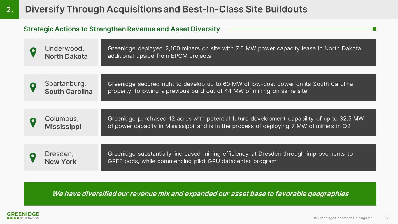 16 In 2023, GREE and Infinite Reality commenced a partnership including a share swap in which GREE will provide GPU access to Infinite Reality clients in exchange for a profit share 1. Case Study: Infinite Reality Data Center D  Access to power assets convertible into data centers through existing sites  Network of potential stranded power assets through Controlling Shareholder D  High demand for power to support rapid growth of Infinite Reality  Existing power options (e.g. AWS) are prohibitively expensive D Blueprint for future buildouts with new partners Data center multiples are extremely robust (~20x / EBITDA) Cheaper option to power AI needs and support business growth ROFR on GREE sites; runway for continued expansion Further diversify revenue base Significant Opportunity for Mutual Growth Situation Overview © Greenidge Generation Holdings Inc.