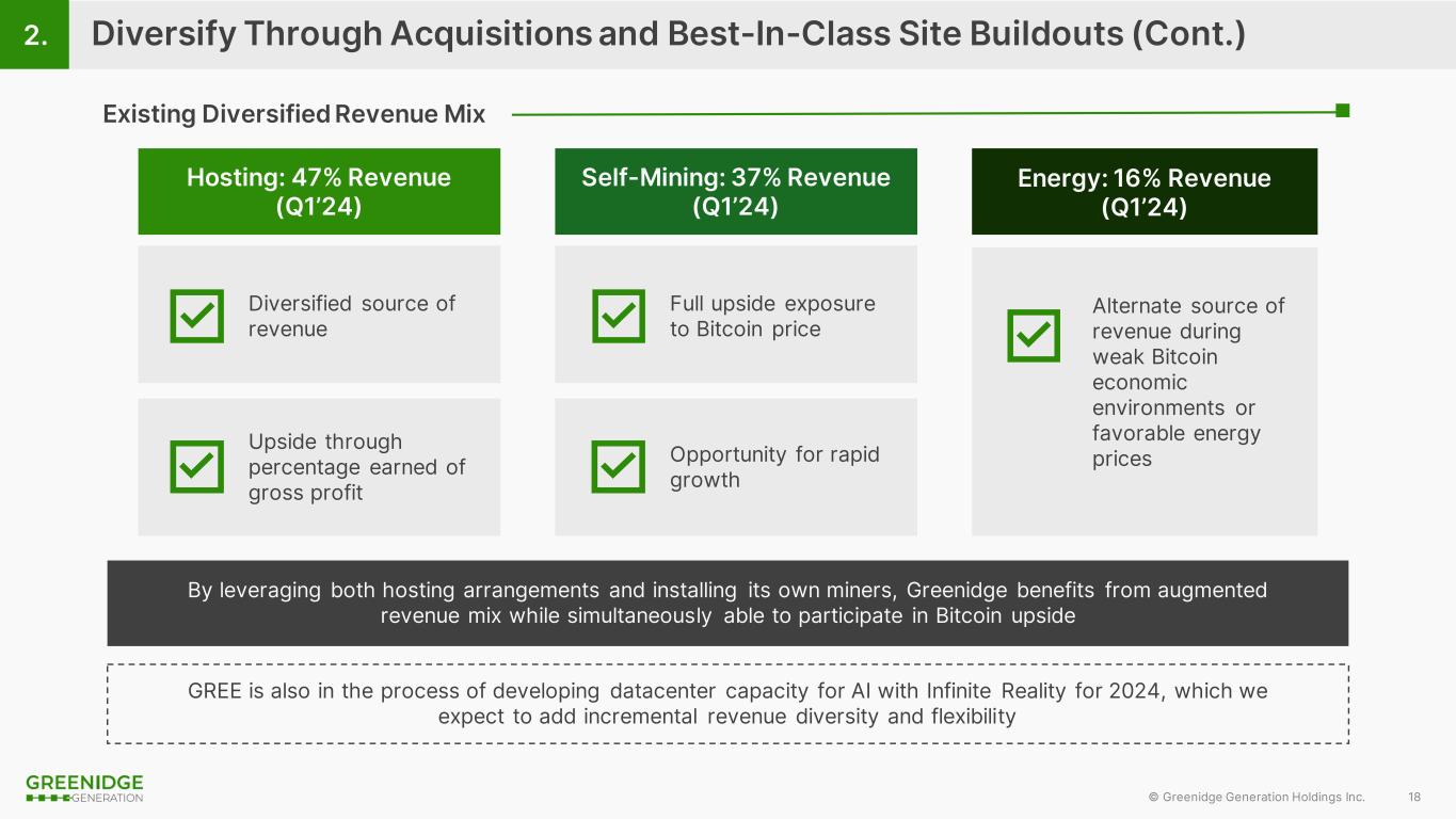 Diversify Through Acquisitions and Best-In-Class Site Buildouts 17 Strategic Actions to Strengthen Revenue and Asset Diversity We have diversified our revenue mix and expanded our asset base to favorable geographies 2. Greenidge deployed 2,100 miners on site with 7.5 MW power capacity lease in North Dakota; additional upside from EPCM projects Underwood, North Dakota Greenidge secured right to develop up to 60 MW of low-cost power on its South Carolina property, following a previous build out of 44 MW of mining on same site Spartanburg, South Carolina Greenidge purchased 12 acres with potential future development capability of up to 32.5 MW of power capacity in Mississippi and is in the process of deploying 7 MW of miners in Q2 Columbus, Mississippi Greenidge substantially increased mining efficiency at Dresden through improvements to GREE pods, while commencing pilot GPU datacenter program Dresden, New York © Greenidge Generation Holdings Inc.