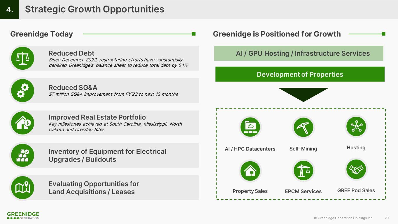 19 3. De-Leveraging Efforts Total Debt as of December 2022 Net Debt as of April 2024 $157 mm $58 mm Less: $10mm Less: $75mm Less: $14mm Increased Cash Position Eliminated B. Riley Debt Eliminated NYDIG Debt $72 mm Total Debt as of April 2024 Since December 2022, restructuring efforts have substantially derisked Greenidge’s balance sheet to reduce total debt by 54% © Greenidge Generation Holdings Inc.