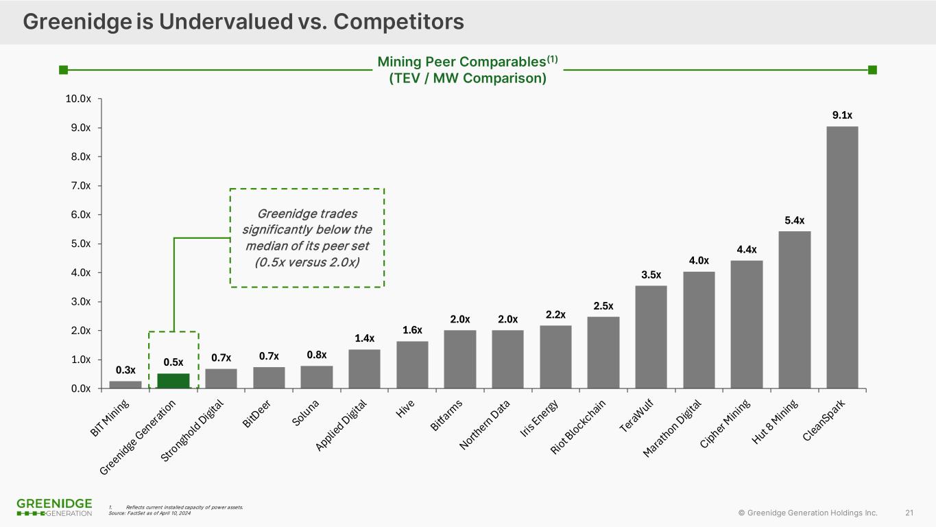 Greenidge is Undervalued vs. Competitors 21 Mining Peer Comparables(1) (TEV / MW Comparison) 1. Reflects current installed capacity of power assets. Source: FactSet as of April 10, 2024 0.3x 0.5x 0.7x 0.7x 0.8x 1.4x 1.6x 2.0x 2.0x 2.2x 2.5x 3.5x 4.0x 4.4x 5.4x 9.1x 0.0x 1.0x 2.0x 3.0x 4.0x 5.0x 6.0x 7.0x 8.0x 9.0x 10.0x Greenidge trades significantly below the median of its peer set (0.5x versus 2.0x) © Greenidge Generation Holdings Inc.