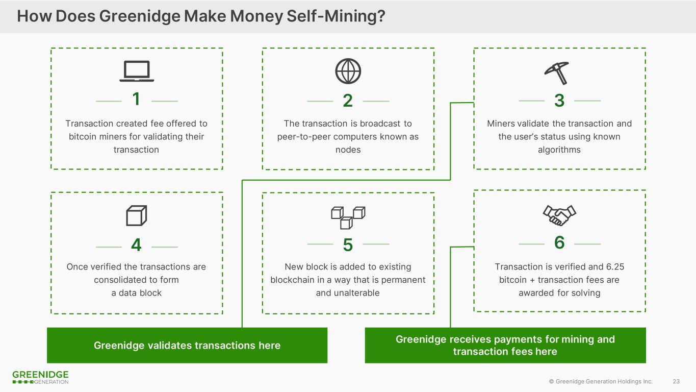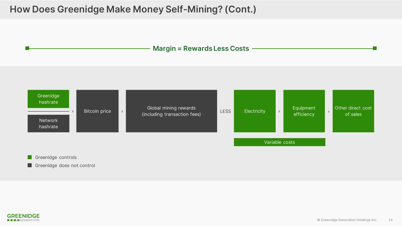How Does Greenidge Make Money Self-Mining? 23 Greenidge validates transactions here Greenidge receives payments for mining and transaction fees here Once verified the transactions are consolidated to form a data block Transaction created fee offered to bitcoin miners for validating their transaction 1 4 The transaction is broadcast to peer-to-peer computers known as nodes 2 New block is added to existing blockchain in a way that is permanent and unalterable 5 Miners validate the transaction and the user’s status using known algorithms Transaction is verified and 6.25 bitcoin + transaction fees are awarded for solving 3 6 © Greenidge Generation Holdings Inc.