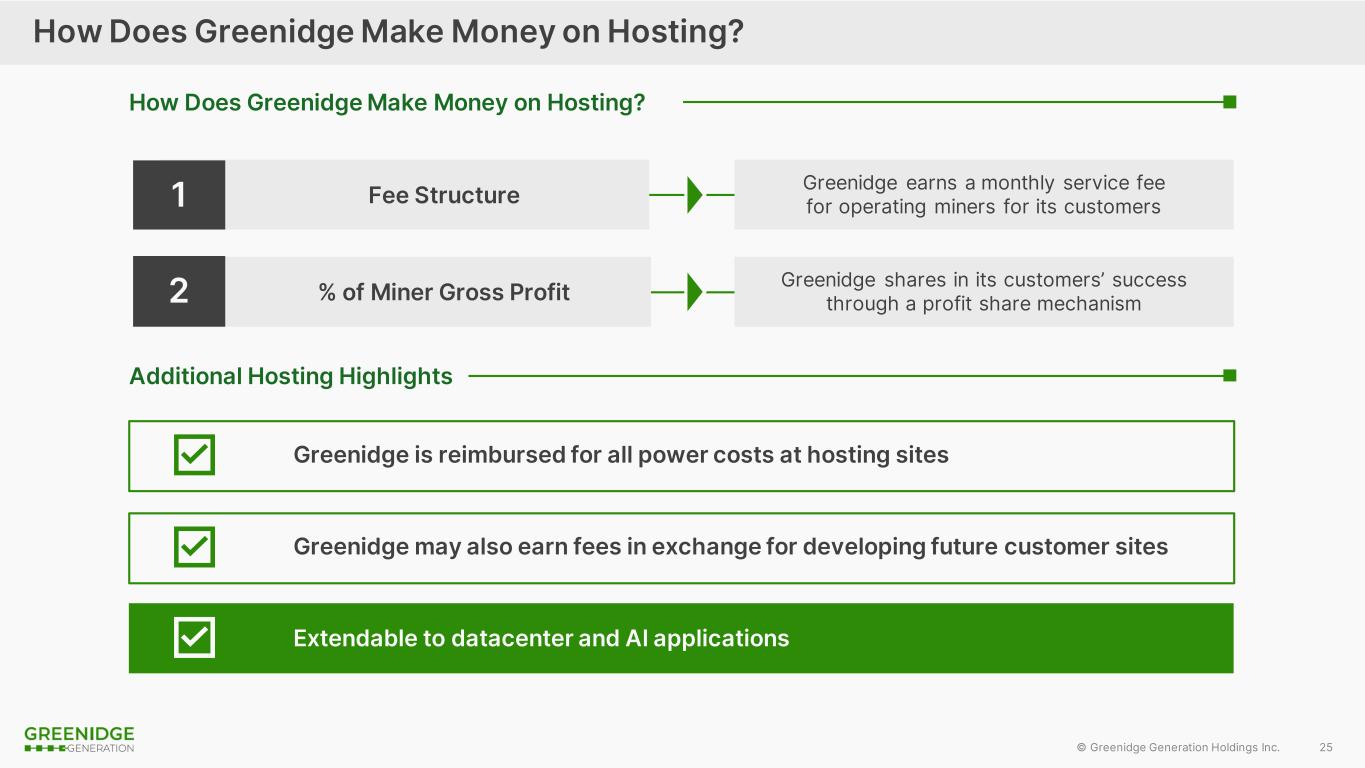 How Does Greenidge Make Money Self-Mining? (Cont.) 24 Electricity Equipment efficiency Other direct cost of sales Variable costs Global mining rewards (including transaction fees) Bitcoin price Network hashrate Greenidge hashrate xx LESS x Greenidge controls Greenidge does not control Margin = Rewards Less Costs x © Greenidge Generation Holdings Inc.