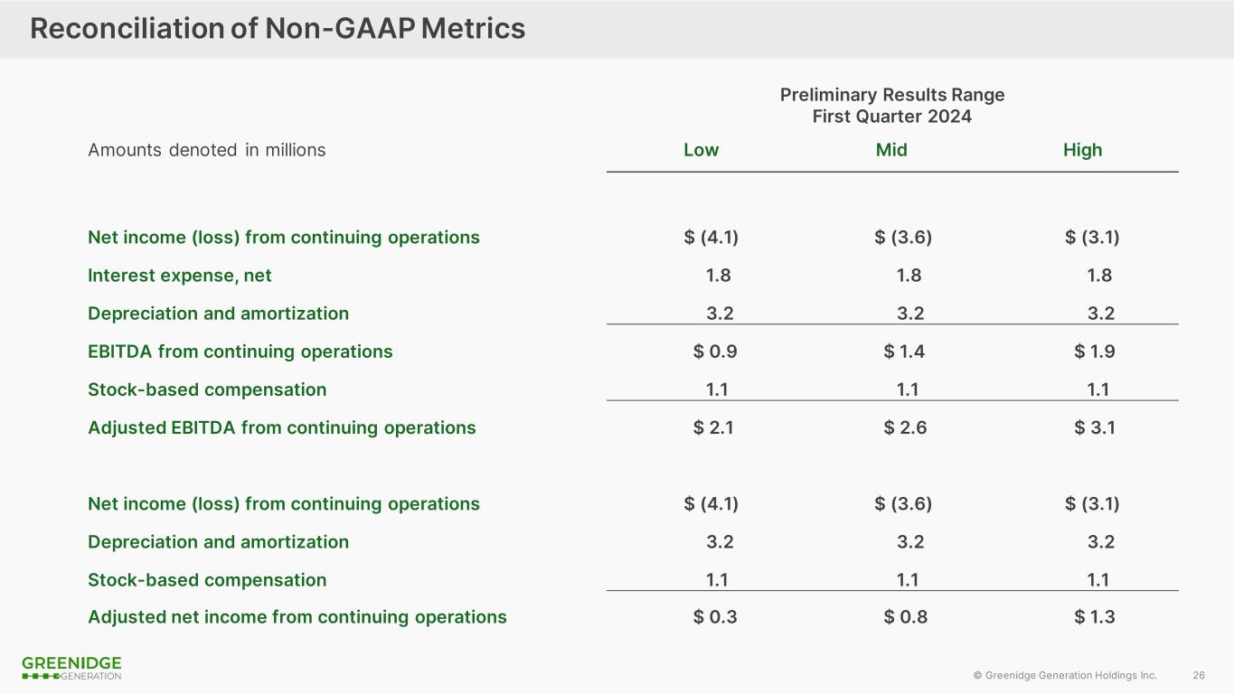 Reconciliation of Non-GAAP Metrics 26 Preliminary Results Range First Quarter 2024 Amounts denoted in millions Low Mid High Net income (loss) from continuing operations $ (4.1) $ (3.6) $ (3.1) Interest expense, net 1.8 1.8 1.8 Depreciation and amortization 3.2 3.2 3.2 EBITDA from continuing operations $ 0.9 $ 1.4 $ 1.9 Stock-based compensation 1.1 1.1 1.1 Adjusted EBITDA from continuing operations $ 2.1 $ 2.6 $ 3.1 Net income (loss) from continuing operations $ (4.1) $ (3.6) $ (3.1) Depreciation and amortization 3.2 3.2 3.2 Stock-based compensation 1.1 1.1 1.1 Adjusted net income from continuing operations $ 0.3 $ 0.8 $ 1.3 © Greenidge Generation Holdings Inc.