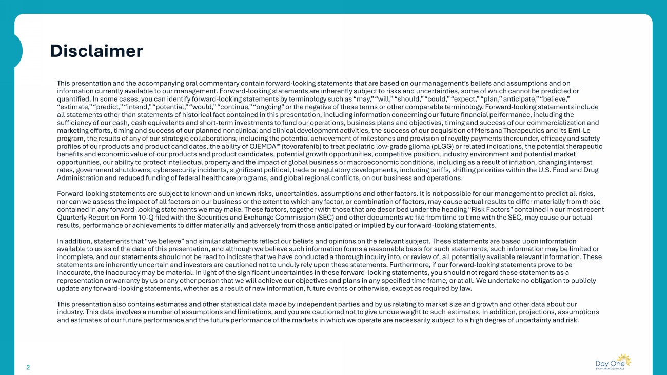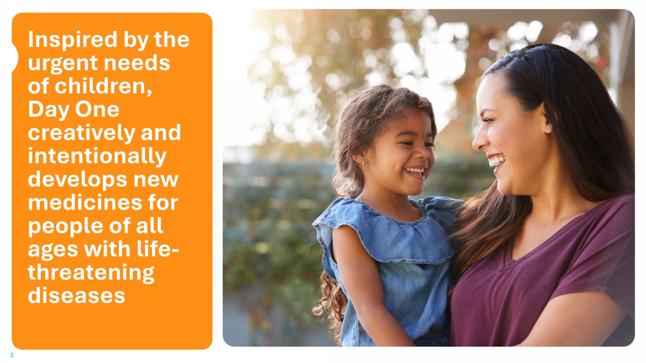 2 Disclaimer This presentation and the accompanying oral commentary contain forward - looking statements that are based on our management’s bel iefs and assumptions and on information currently available to our management. Forward - looking statements are inherently subject to risks and uncertainties, some of whi ch cannot be predicted or quantified. In some cases, you can identify forward - looking statements by terminology such as “may,” “will,” “should,” “could,” “expect,” “plan,” anticipate,” “believe,” “estimate,” “predict,” “intend,” “potential,” “would,” “continue,” “ongoing” or the negative of these terms or other comparab le terminology. Forward - looking statements include all statements other than statements of historical fact contained in this presentation, including information concerning our fut ure financial performance, including the sufficiency of our cash, cash equivalents and short - term investments to fund our operations, business plans and objectives, timi ng and success of our commercialization and marketing efforts, timing and success of our planned nonclinical and clinical development activities, the success of our acquisition of Mersana Therapeutics and its Emi - Le program, the results of any of our strategic collaborations, including the potential achievement of milestones and provision of royalty payments thereunder, efficacy and safety profiles of our products and product candidates, the ability of OJEMDA ( tovorafenib ) to treat pediatric low - grade glioma (pLGG) or related indications, the potential therapeutic benefits and economic value of our products and product candidates, potential growth opportunities, competitive position, ind ust ry environment and potential market opportunities, our ability to protect intellectual property and the impact of global business or macroeconomic conditions, in clu ding as a result of inflation, changing interest rates, government shutdowns, cybersecurity incidents, significant political, trade or regulatory developments, including tari ffs , shifting priorities within the U.S. Food and Drug Administration and reduced funding of federal healthcare programs, and global regional conflicts, on our business and operati ons . Forward - looking statements are subject to known and unknown risks, uncertainties, assumptions and other factors. It is not possi ble for our management to predict all risks, nor can we assess the impact of all factors on our business or the extent to which any factor, or combination of factors, may ca use actual results to differ materially from those contained in any forward - looking statements we may make. These factors, together with those that are described under the heading “Risk Factors” contained in our most recent Quarterly Report on Form 10 - Q filed with the Securities and Exchange Commission (SEC) and other documents we file from time to t ime with the SEC, may cause our actual results, performance or achievements to differ materially and adversely from those anticipated or implied by our forward - looking statements. In addition, statements that “we believe” and similar statements reflect our beliefs and opinions on the relevant subject. Th ese statements are based upon information available to us as of the date of this presentation, and although we believe such information forms a reasonable basis for su ch statements, such information may be limited or incomplete, and our statements should not be read to indicate that we have conducted a thorough inquiry into, or review of, a ll potentially available relevant information. These statements are inherently uncertain and investors are cautioned not to unduly rely upon these statements. Furthermore, if our fo rward - looking statements prove to be inaccurate, the inaccuracy may be material. In light of the significant uncertainties in these forward - looking statements, you s hould not regard these statements as a representation or warranty by us or any other person that we will achieve our objectives and plans in any specified time fram e, or at all. We undertake no obligation to publicly update any forward - looking statements, whether as a result of new information, future events or otherwise, except as required by law. This presentation also contains estimates and other statistical data made by independent parties and by us relating to market si ze and growth and other data about our industry. This data involves a number of assumptions and limitations, and you are cautioned not to give undue weight to such est imates. In addition, projections, assumptions and estimates of our future performance and the future performance of the markets in which we operate are necessarily subject to a high degree of uncertainty and risk.