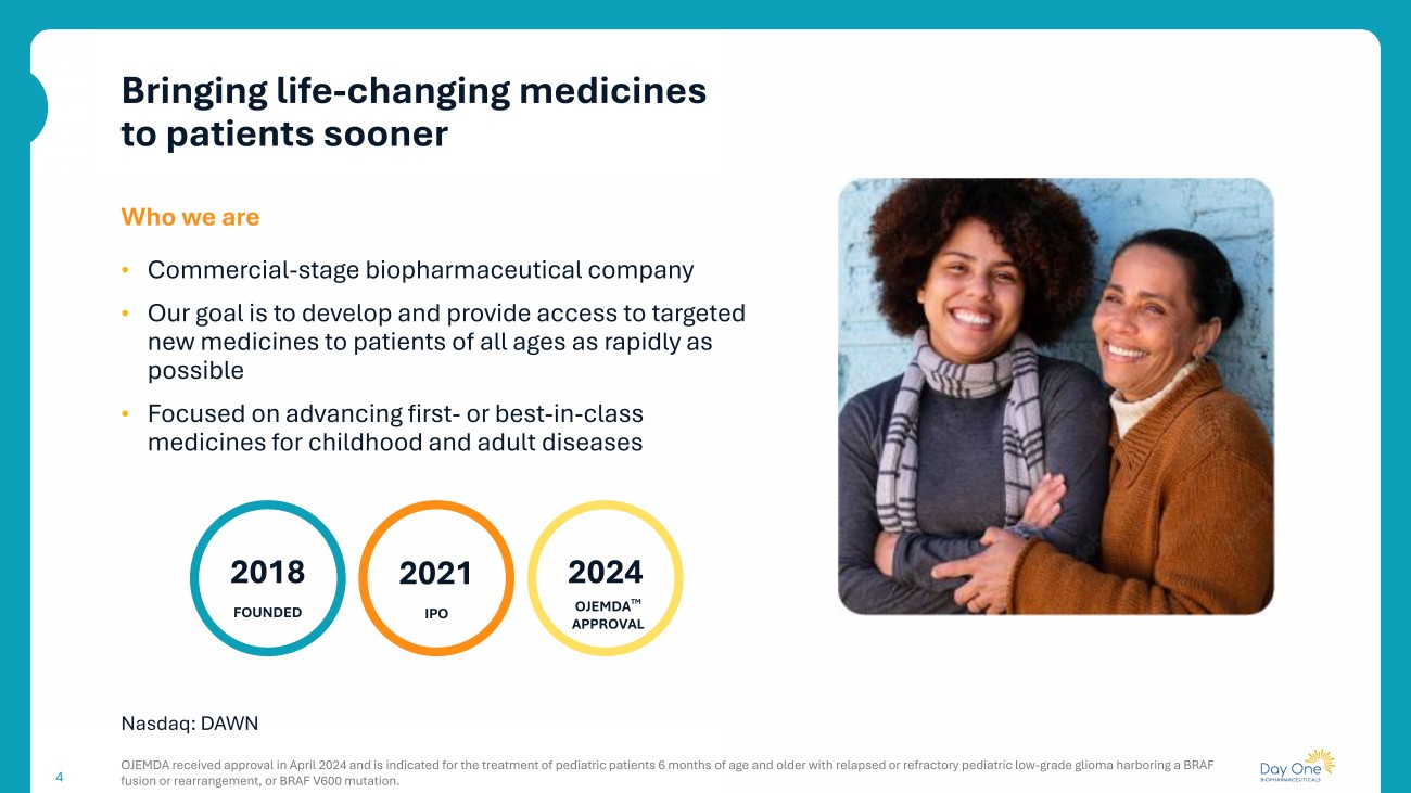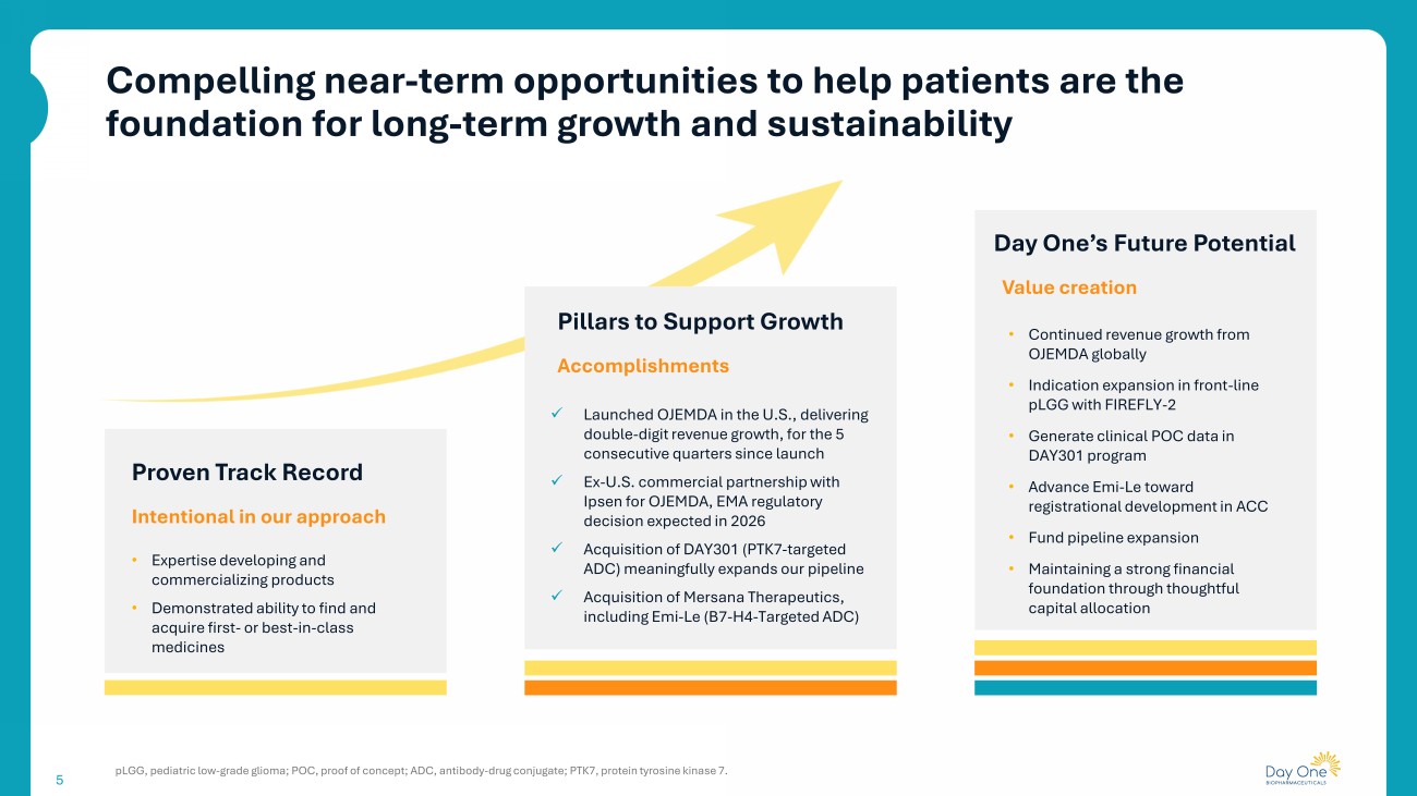 Bringing life - changing medicines to patients sooner 4 • Commercial - stage biopharmaceutical company • Our goal is to develop and provide access to targeted new medicines to patients of all ages as rapidly as possible • Focused on advancing first - or best - in - class medicines for childhood and adult diseases Who we are OJEMDA received approval in April 2024 and is indicated for the treatment of pediatric patients 6 months of age and older wit h r elapsed or refractory pediatric low - grade glioma harboring a BRAF fusion or rearrangement, or BRAF V600 mutation. 2021 IPO 2018 FOUNDED 2024 OJEMDA TM APPROVAL Nasdaq: DAWN