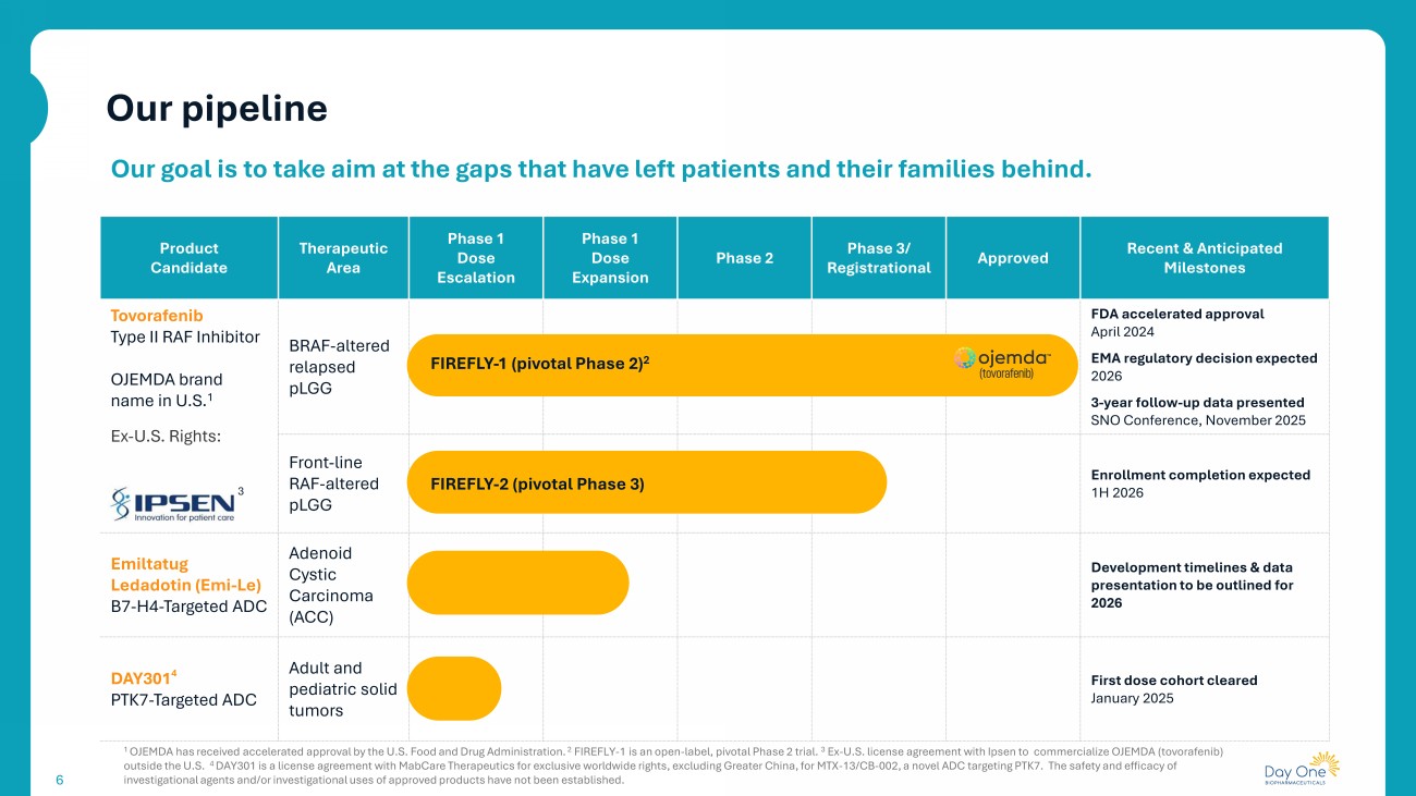 5 Day One’s Future Potential Value creation • Continued revenue growth from OJEMDA globally • Indication expansion in front - line pLGG with FIREFLY - 2 • Generate clinical POC data in DAY301 program • Advance Emi - Le toward registrational development in ACC • Fund pipeline expansion • Maintaining a strong financial foundation through thoughtful capital allocation Proven Track Record Intentional in our approach • Expertise developing and commercializing products • Demonstrated ability to find and acquire first - or best - in - class medicines Pillars to Support Growth Accomplishments x Launched OJEMDA in the U.S., delivering double - digit revenue growth, for the 5 consecutive quarters since launch x Ex - U.S. commercial partnership with Ipsen for OJEMDA, EMA regulatory decision expected in 2026 x Acquisition of DAY301 (PTK7 - targeted ADC) meaningfully expands our pipeline x Acquisition of Mersana Therapeutics, including Emi - Le (B7 - H4 - Targeted ADC) Compelling near - term opportunities to help patients are the foundation for long - term growth and sustainability pLGG, pediatric low - grade glioma; POC, proof of concept; ADC, antibody - drug conjugate; PTK7, protein tyrosine kinase 7. 5