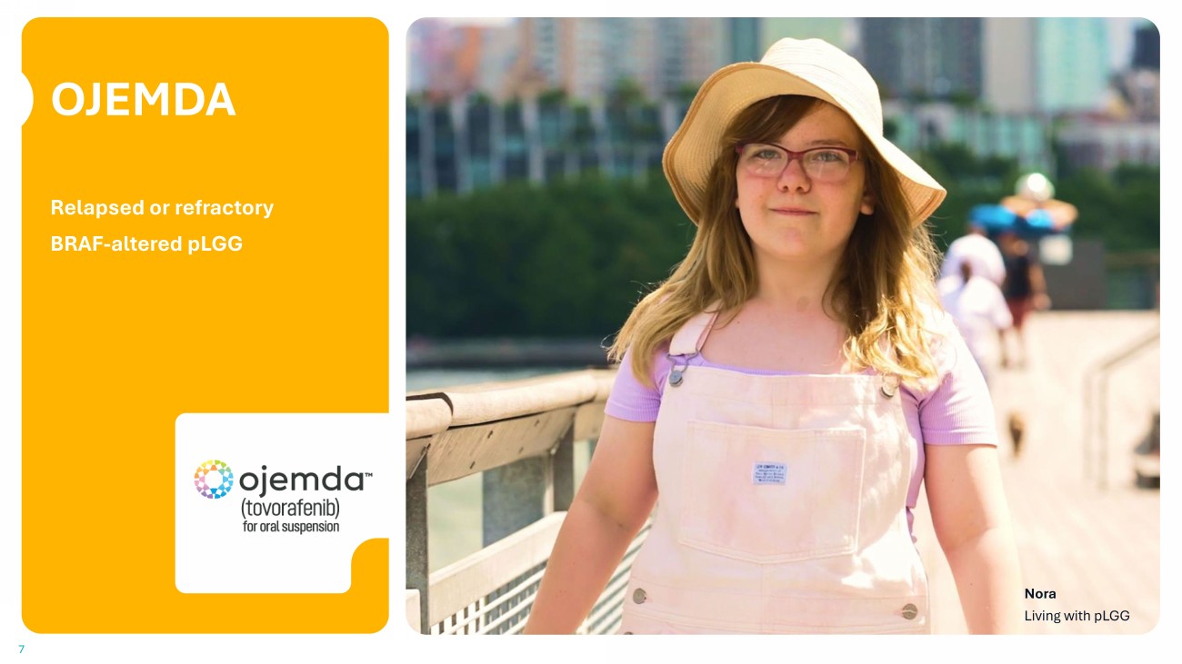 Recent & Anticipated Milestones Approved Phase 3/ Registrational Phase 2 Phase 1 Dose Expansion Phase 1 Dose Escalation Therapeutic Area Product Candidate FDA accelerated approval April 2024 EMA regulatory decision expected 2026 3 - year follow - up data presented SNO Conference, November 2025 BRAF - altered relapsed pLGG Tovorafenib Type II RAF Inhibitor OJEMDA brand name in U.S. 1 Ex - U.S. Rights: 3 Enrollment completion expected 1H 2026 Front - line RAF - altered pLGG Development timelines & data presentation to be outlined for 2026 Adenoid Cystic Carcinoma (ACC) Emiltatug Ledadotin (Emi - Le) B7 - H4 - Targeted ADC First dose cohort cleared January 2025 Adult and pediatric solid tumors DAY301 4 PTK7 - Targeted ADC 6 Our goal is to take aim at the gaps that have left patients and their families behind. FIREFLY - 1 (pivotal Phase 2) 2 FIREFLY - 2 (pivotal Phase 3) 1 OJEMDA has received accelerated approval by the U.S. Food and Drug Administration. 2 FIREFLY - 1 is an open - label, pivotal Phase 2 trial. 3 Ex - U.S. license agreement with Ipsen to commercialize OJEMDA ( tovorafenib ) outside the U.S. 4 DAY301 is a license agreement with MabCare Therapeutics for exclusive worldwide rights, excluding Greater China, for MTX - 13/CB - 002, a novel ADC targeting PTK7. The safet y and efficacy of investigational agents and/or investigational uses of approved products have not been established. Our pipeline