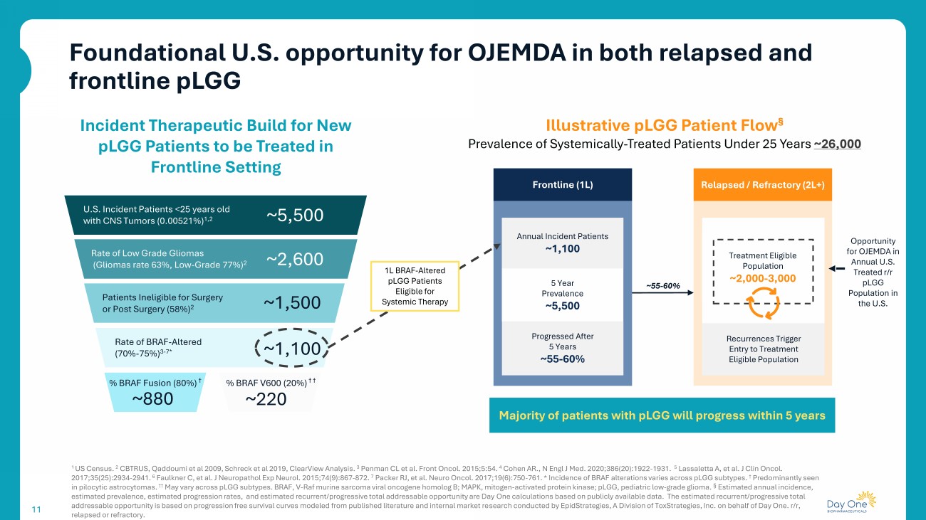 10 Data from Pivotal Phase 2 FIREFLY - 1 trial. • Meaningful tumor stabilization or shrinkage may be possible with OJEMDA, in the clinical trial: • 51% of children experienced tumor shrinkage by at least 25% • 82% of children saw their tumors shrink or remain stable Efficacy Safety • Generally well - tolerated therapy, with 9 out of 10 patients staying on treatment in the clinical trial • Most common grade 3 / 4 adverse events include: anemia, elevated CPK, maculo - papular rash, fatigue & vomiting Dosing • Once - weekly, taken with or without food conveniently from home can mean fewer daily interruptions OJEMDA is indicated for the treatment of patients 6 months of age and older with relapsed or refractory pediatric low - grade glio ma (pLGG) harboring a BRAF fusion, rearrangement, or BRAF V600 mutation. Product profile aligns with what physicians are looking for in a therapy