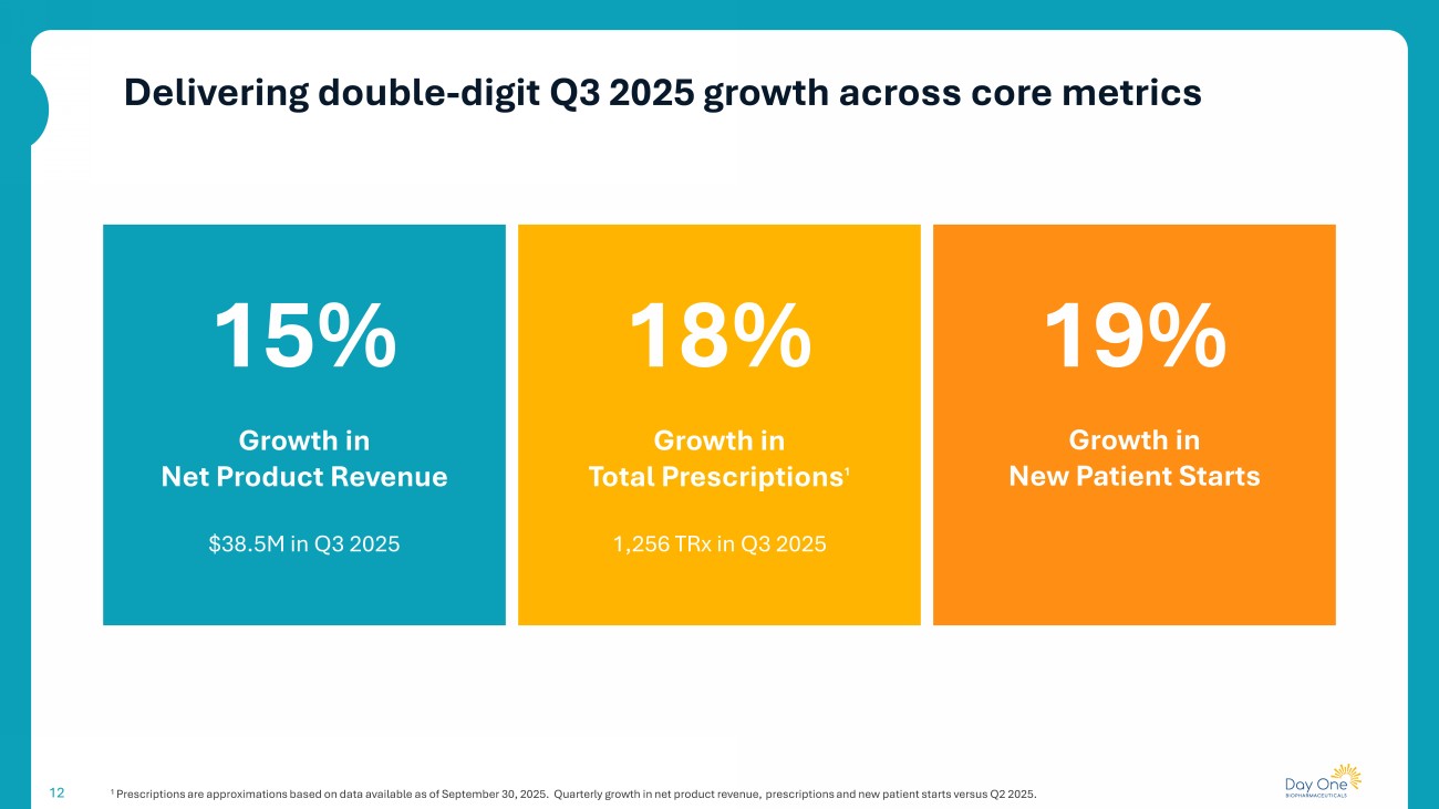 11 1 US Census. 2 CBTRUS, Qaddoumi et al 2009, Schreck et al 2019, ClearView Analysis. 3 Penman CL et al. Front Oncol. 2015;5:54. 4 Cohen AR., N Engl J Med. 2020;386(20):1922 - 1931. 5 Lassaletta A, et al. J Clin Oncol. 2017;35(25):2934 - 2941. 6 Faulkner C, et al. J Neuropathol Exp Neurol. 2015;74(9):867 - 872. 7 Packer RJ, et al. Neuro Oncol. 2017;19(6):750 - 761. * Incidence of BRAF alterations varies across pLGG subtypes. † Predominantly seen in pilocytic astrocytomas . †† May vary across pLGG subtypes. BRAF, V - Raf murine sarcoma viral oncogene homolog B; MAPK, mitogen - activated protein kinase; pLGG , pediatric low - grade glioma. § Estimated annual incidence, estimated prevalence, estimated progression rates, and estimated recurrent/progressive total addressable opportunity are Day On e calculations based on publicly available data. The estimated recurrent/progressive total addressable opportunity is based on progression free survival curves modeled from published literature and internal market re sea rch conducted by EpidStrategies , A Division of ToxStrategies , Inc. on behalf of Day One. r/r, relapsed or refractory. Incident Therapeutic Build for New pLGG Patients to be Treated in Frontline Setting U.S. Incident Patients <25 years old with CNS Tumors (0.00521%) 1,2 ~5,500 Rate of Low Grade Gliomas (Gliomas rate 63%, Low - Grade 77%) 2 ~2,600 ~1,500 Patients Ineligible for Surgery or Post Surgery (58%) 2 ~1,100 % BRAF Fusion (80%) † % BRAF V600 (20%) † † ~880 ~220 Frontline (1L) Annual Incident Patients ~1,100 1L BRAF - Altered pLGG Patients Eligible for Systemic Therapy Illustrative pLGG Patient Flow § Prevalence of Systemically - Treated Patients Under 25 Years ~26,000 5 Year Prevalence ~5,500 Progressed After 5 Years ~55 - 60% Relapsed / Refractory (2L+) ~55 - 60% Majority of patients with pLGG will progress within 5 years Opportunity for OJEMDA in Annual U.S. Treated r/r pLGG Population in the U.S. Rate of BRAF - Altered (70% - 75%) 3 - 7* Treatment Eligible Population ~2,000 - 3,000 Recurrences Trigger Entry to Treatment Eligible Population Foundational U.S. opportunity for OJEMDA in both relapsed and frontline pLGG 11