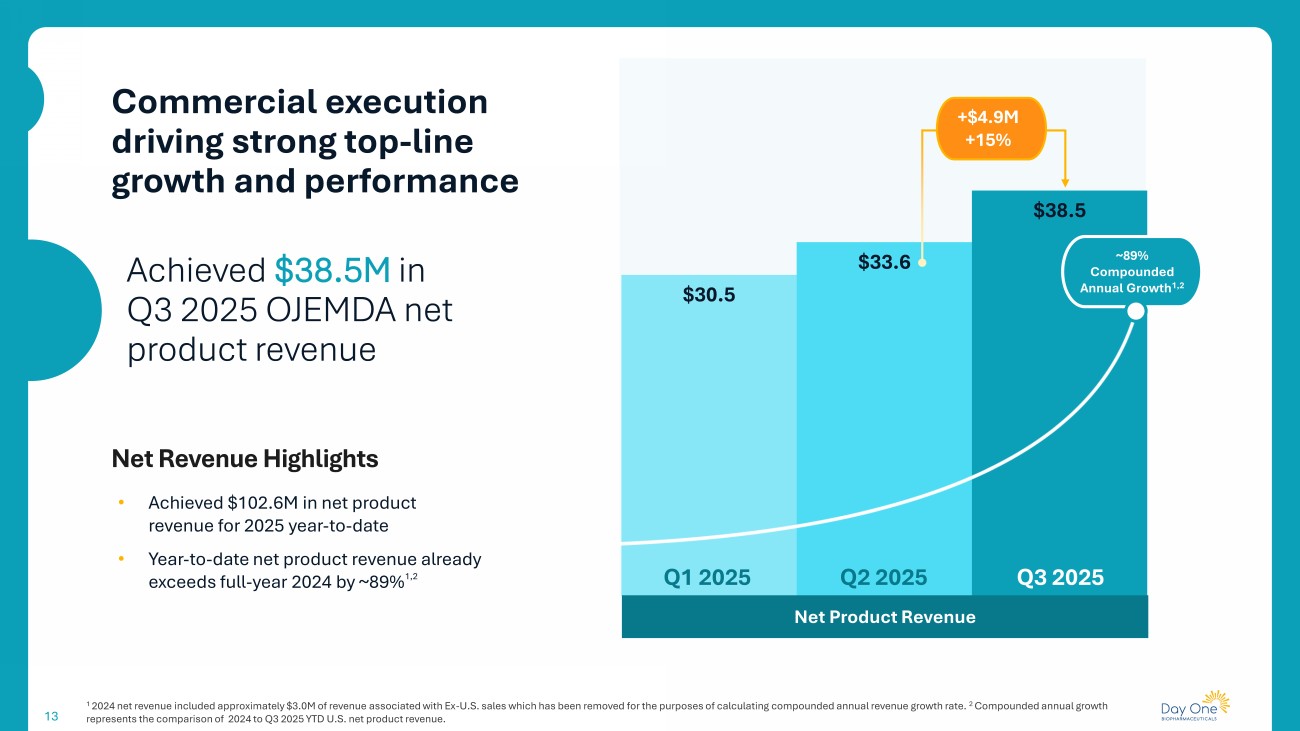 Delivering double - digit Q3 2025 growth across core metrics 12 1 Prescriptions are approximations based on data available as of September 30, 2025. Quarterly growth in net product revenue, pre scriptions and new patient starts versus Q2 2025. 15% Growth in Net Product Revenue 18% $38.5M in Q3 2025 19% Growth in New Patient Starts Growth in Total Prescriptions 1 1,256 TRx in Q3 2025