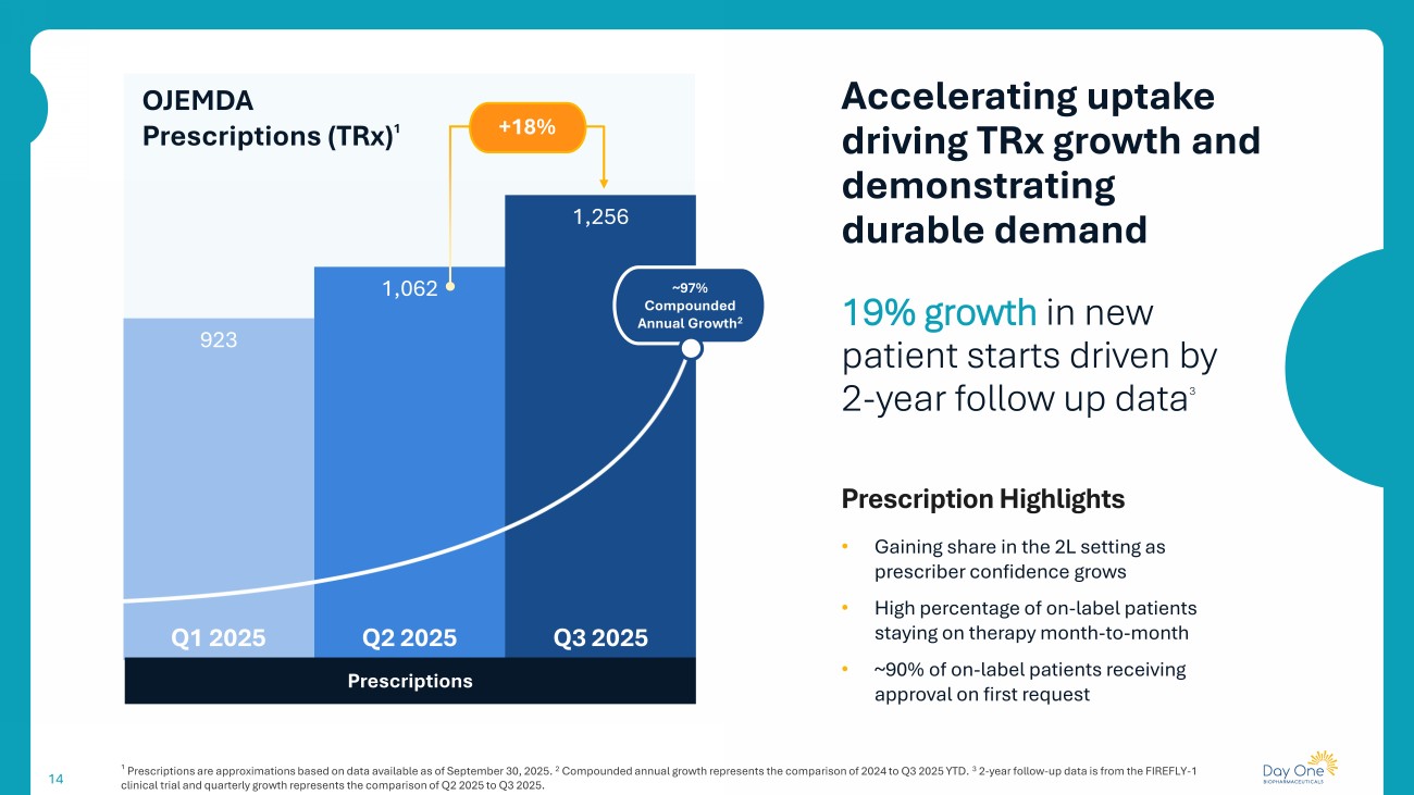 13 1 2024 net revenue included approximately $3.0M of revenue associated with Ex - U.S. sales which has been removed for the purposes o f calculating compounded annual revenue growth rate. 2 Compounded annual growth represents the comparison of 2024 to Q3 2025 YTD U.S. net product revenue. Commercial execution driving strong top - line growth and performance $30.5 $33.6 $38.5 Net Product Revenue Q3 2025 Q1 2025 Q2 2025 +$4.9M +15% ~89% Compounded Annual Growth 1,2 Achieved $38.5M in Q3 2025 OJEMDA net product revenue Net Revenue Highlights • Achieved $102.6M in net product revenue for 2025 year - to - date • Year - to - date net product revenue already exceeds full - year 2024 by ~89% 1,2