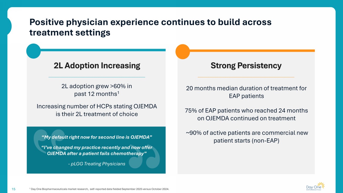 923 1,062 1,256 14 19% growth in new patient starts driven by 2 - year follow up data 3 Prescription Highlights • Gaining share in the 2L setting as prescriber confidence grows • High percentage of on - label patients staying on therapy month - to - month • ~90% of on - label patients receiving approval on first request Accelerating uptake driving TRx growth and demonstrating durable demand Prescriptions OJEMDA Prescriptions ( TRx ) 1 Q3 2025 Q1 2025 Q2 2025 ¹ Prescriptions are approximations based on data available as of September 30, 2025. 2 Compounded annual growth represents the comparison of 2024 to Q3 2025 YTD. 3 2 - year follow - up data is from the FIREFLY - 1 clinical trial and quarterly growth represents the comparison of Q2 2025 to Q3 2025. ~97% Compounded Annual Growth 2 +18%
