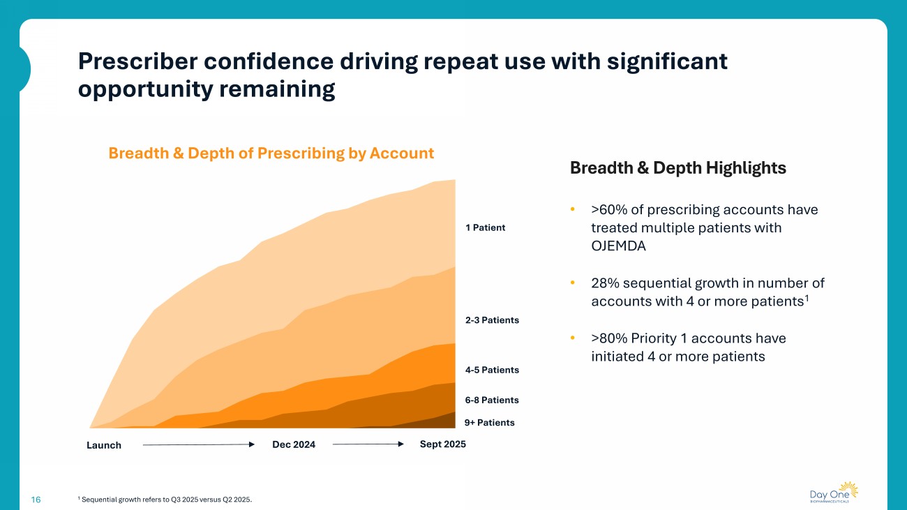 Positive physician experience continues to build across treatment settings 15 1 Day One Biopharmaceuticals market research, self - reported data fielded September 2025 versus October 2024. Strong Persistency 2L Adoption Increasing 20 months median duration of treatment for EAP patients 75% of EAP patients who reached 24 months on OJEMDA continued on treatment ~90% of active patients are commercial new patient starts (non - EAP) 2L adoption grew >60% in past 12 months 1 Increasing number of HCPs stating OJEMDA is their 2L treatment of choice “My default right now for second line is OJEMDA” “I’ve changed my practice recently and now offer OJEMDA after a patient fails chemotherapy” - pLGG Treating Physicians