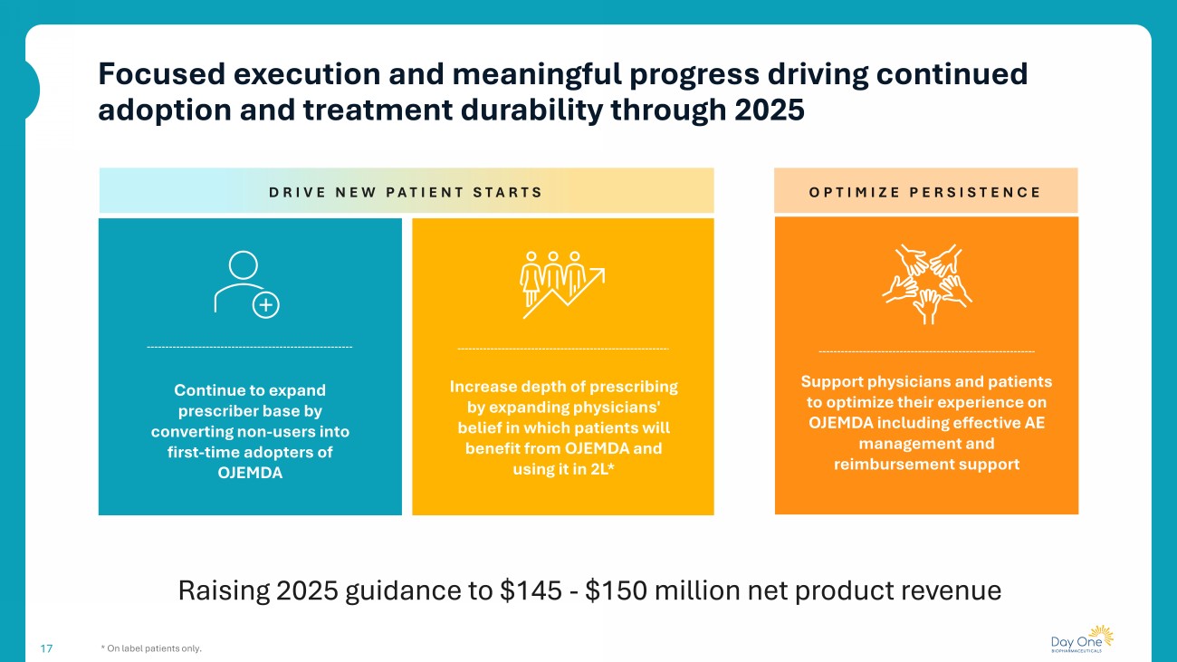 16 1 Sequential growth refers to Q3 2025 versus Q2 2025. • >60% of prescribing accounts have treated multiple patients with OJEMDA • 28% sequential growth in number of accounts with 4 or more patients 1 • >80% Priority 1 accounts have initiated 4 or more patients Launch Dec 2024 Sept 2025 1 Patient 2 - 3 Patients 4 - 5 Patients 6 - 8 Patients 9+ Patients Breadth & Depth of Prescribing by Account Breadth & Depth Highlights Prescriber confidence driving repeat use with significant opportunity remaining