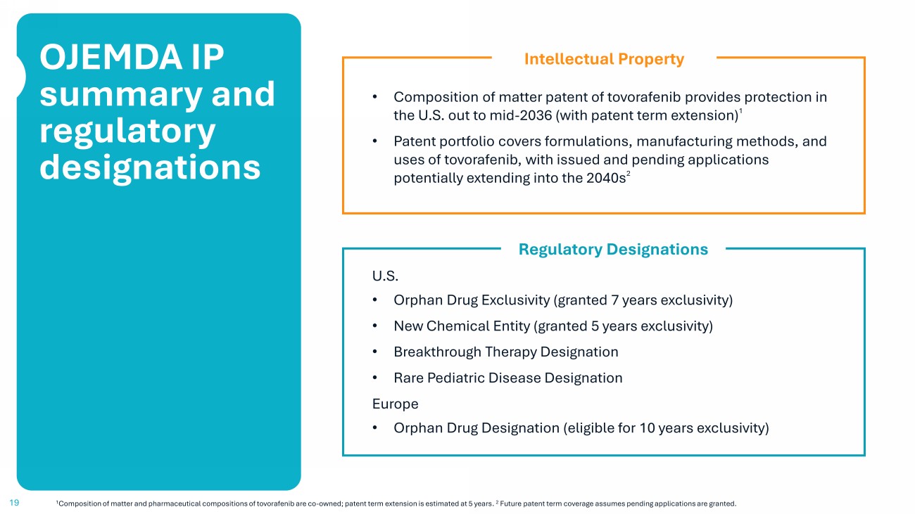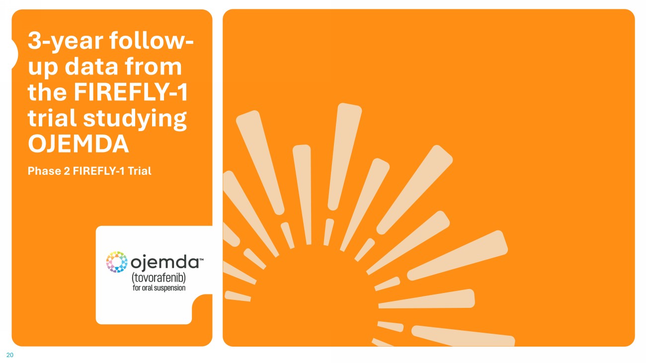 We continue to strengthen the OJEMDA story through enhancing the target product profile and data generation 18 FIREFLY - 1 3 - Year Data Highlighting clinical stability following treatment with OJEMDA and opportunity for retreatment Potential to further expand physician confidence and adoption while reinforcing target product profile Presentation at SNO conference in November 2025; publication efforts underway Establishing OJEMDA as the Standard of Care in 2L r/r BRAF - altered pLGG