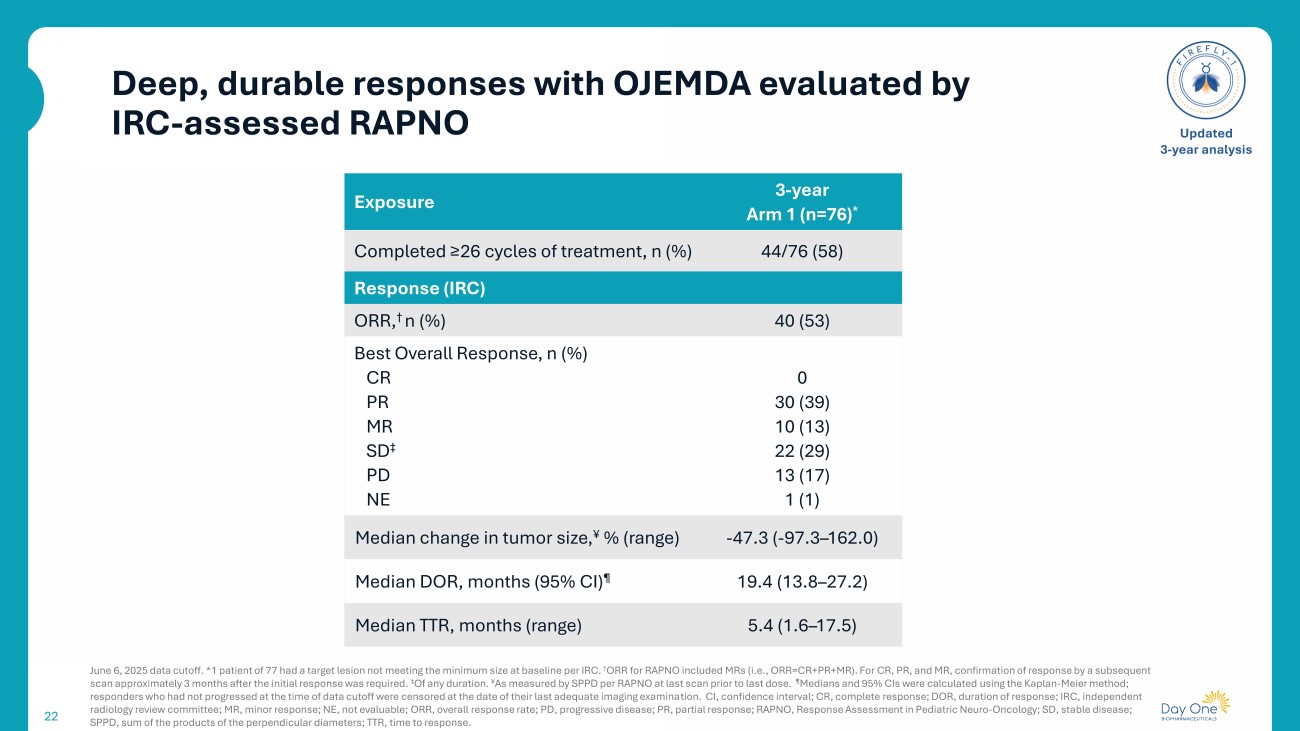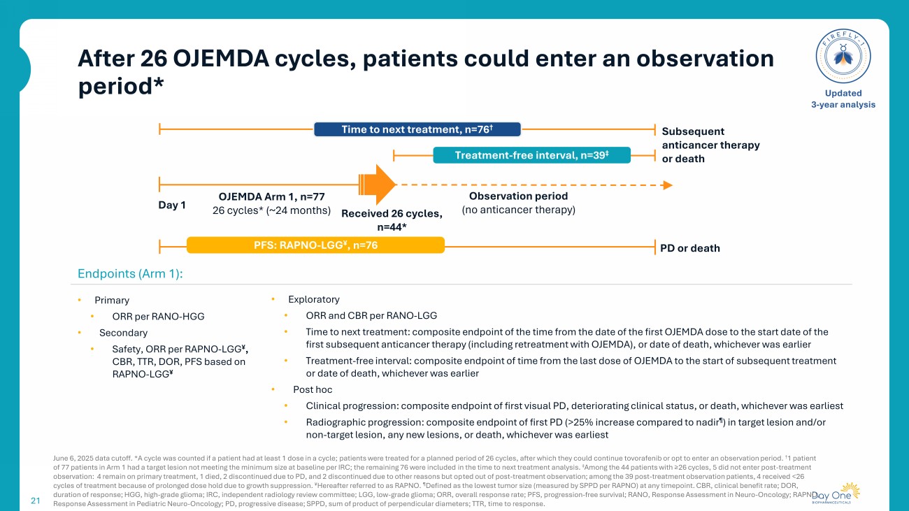 After 26 OJEMDA cycles, patients could enter an observation period* 21 June 6, 2025 data cutoff. *A cycle was counted if a patient had at least 1 dose in a cycle; patients were treated for a planned period of 26 cycles, after which they could continue tovorafenib or opt to enter an observation period. † 1 patient of 77 patients in Arm 1 had a target lesion not meeting the minimum size at baseline per IRC; the remaining 76 were included in the time to next treatment analysis. ‡ Among the 44 patients with ≥26 cycles, 5 did not enter post - treatment observation: 4 remain on primary treatment, 1 died, 2 discontinued due to PD, and 2 discontinued due to other reasons but op ted out of post - treatment observation; among the 39 post - treatment observation patients, 4 received <26 cycles of treatment because of prolonged dose hold due to growth suppression. ¥ Hereafter referred to as RAPNO. ¶ Defined as the lowest tumor size (measured by SPPD per RAPNO) at any timepoint. CBR, clinical benefit rate; DOR, duration of response; HGG, high - grade glioma; IRC, independent radiology review committee; LGG, low - grade glioma; ORR, overall r esponse rate; PFS, progression - free survival; RANO, Response Assessment in Neuro - Oncology ; RAPNO, Response Assessment in Pediatric Neuro - Oncology; PD, progressive disease; SPPD, sum of product of perpendicular diameters; TTR, time to response . Updated 3 - year analysis Endpoints (Arm 1): • Primary • ORR per RANO - HGG • Secondary • Safety, ORR per RAPNO - LGG ¥ , CBR, TTR, DOR, PFS based on RAPNO - LGG ¥ • Exploratory • ORR and CBR per RANO - LGG • Time to next treatment: composite endpoint of the time from the date of the first OJEMDA dose to the start date of the first subsequent anticancer therapy (including retreatment with OJEMDA), or date of death, whichever was earlier • Treatment - free interval: composite endpoint of time from the last dose of OJEMDA to the start of subsequent treatment or date of death, whichever was earlier • Post hoc • Clinical progression: composite endpoint of first visual PD, deteriorating clinical status, or death, whichever was earliest • Radiographic progression: composite endpoint of first PD (>25% increase compared to nadir ¶ ) in target lesion and/or non - target lesion, any new lesions, or death, whichever was earliest Subsequent anticancer therapy or death OJEMDA Arm 1, n=77 26 cycles* (~24 months) Received 26 cycles, n=44* Observation period ( no anticancer therapy) Time to next treatment, n=76 † Treatment - free inter val , n=39 ‡ Day 1 PD or death PFS: RAPNO - LGG ¥ , n=76
