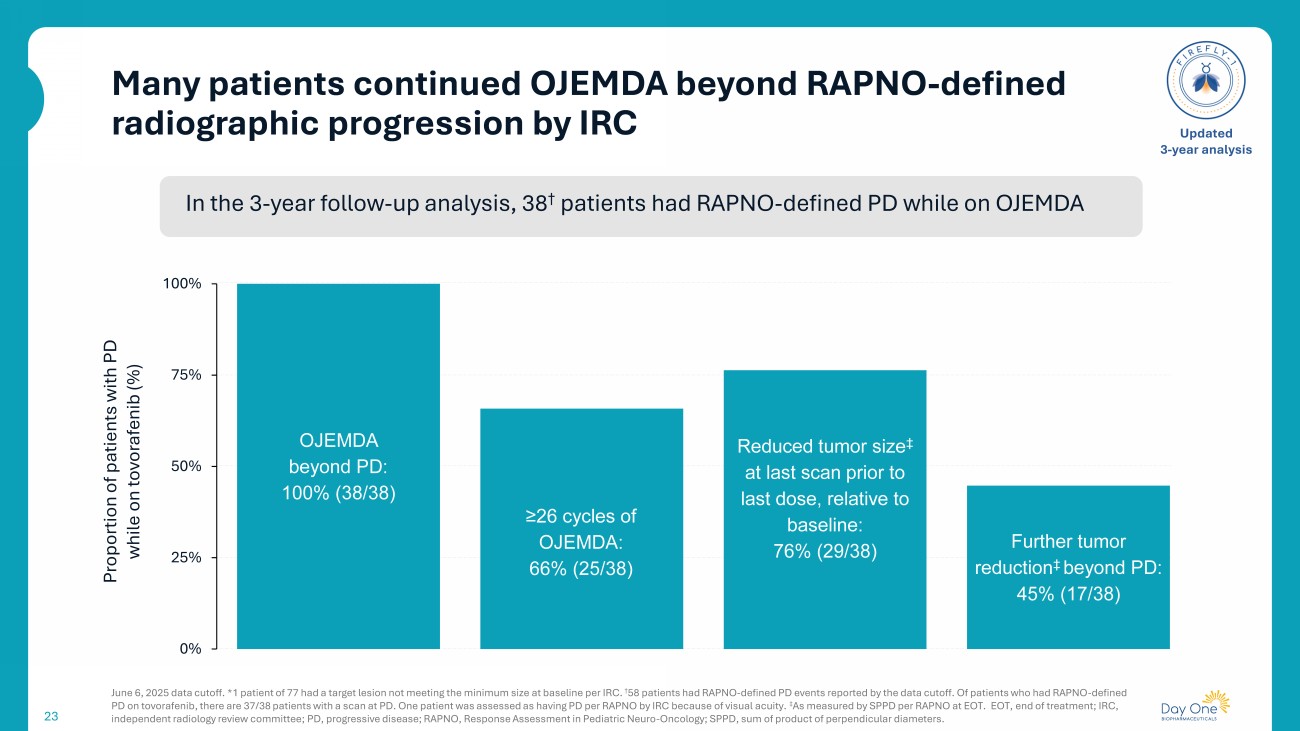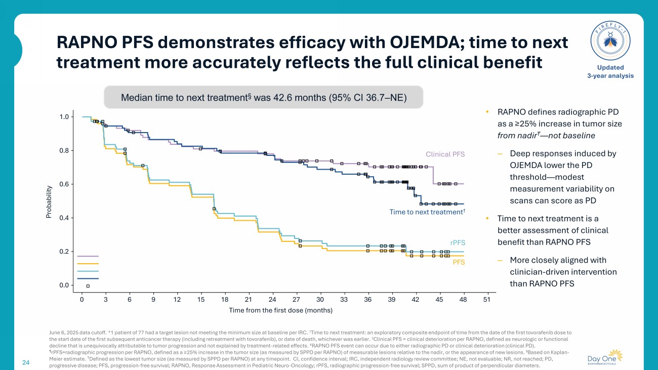 RAPNO PFS demonstrates efficacy with OJEMDA; time to next treatment more accurately reflects the full clinical benefit 24 June 6, 2025 data cutoff. *1 patient of 77 had a target lesion not meeting the minimum size at baseline per IRC. † T ime to next treatment : an exploratory composite endpoint of time from the date of the first tovorafenib dose to the start date of the first subsequent anticancer therapy (including retreatment with tovorafenib ), or date of death, whichever was earlier . ‡ Clinical PFS = clinical deterioration per RAPNO, defined as neurologic or functional decline that is unequivocally attributable to tumor progression and not explained by treatment - related effects. ¥ RAPNO PFS event can occur due to either radiographic PD or clinical deterioration (clinical PD). ¶ rPFS =radiographic progression per RAPNO, defined as a ≥25% increase in the tumor size (as measured by SPPD per RAPNO) of measurab le lesions relative to the nadir, or the appearance of new lesions. § Based on Kaplan - Meier estimate. ₸ Defined as the lowest tumor size (as measured by SPPD per RAPNO) at any timepoint. CI, confidence interval; IRC, independent radiology review committee ; NE, not evaluable; NR, not reached; PD, progressive disease; PFS, progression - free survival; RAPNO, Response Assessment in Pediatric Neuro - Oncology ; rPFS , radiographic progression - free survival; SPPD, sum of product of perpendicular diameters . Updated 3 - year analysis 1.0 0.0 0 3 6 9 12 15 18 21 24 27 30 33 36 39 42 45 48 51 Time from the first dose (months) 0.8 0.6 0.4 0.2 Probability Clinical PFS rPFS PFS T ime to next treatment † Median time to next treatment § was 42.6 months (95% CI 36.7 – NE) • RAPNO defines radiographic PD as a ≥25% increase in tumor size from nadir ₸ — not baseline – Deep responses induced by OJEMDA lower the PD threshold — modest measurement variability on scans can score as PD • Time to next treatment is a better assessment of clinical benefit than RAPNO PFS – More closely aligned with clinician - driven intervention than RAPNO PFS