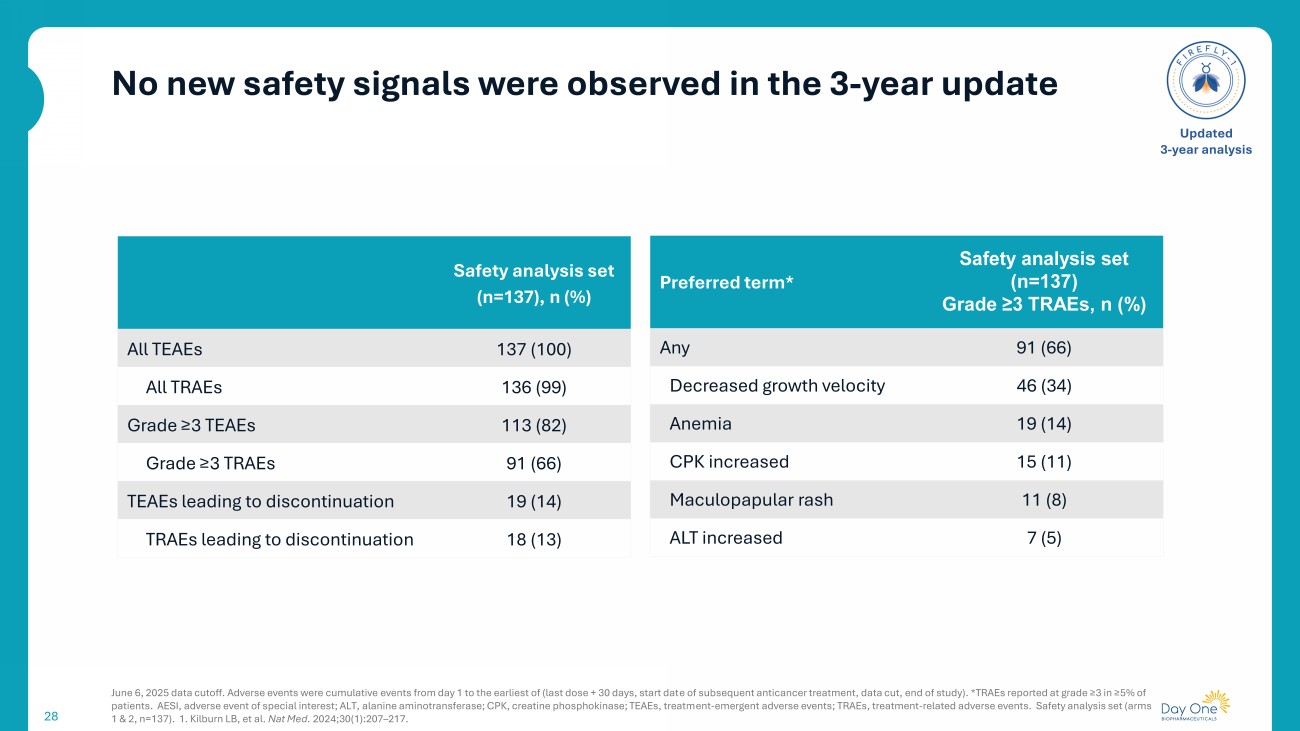 No new safety signals were observed in the 3 - year update 28 June 6, 2025 data cutoff. Adverse events were cumulative events from day 1 to the earliest of (last dose + 30 days, start dat e o f subsequent anticancer treatment , data cut, end of study ). *TRAEs reported at grade ≥3 in ≥5% of patients. AESI, adverse event of special interest; ALT, alanine aminotransferase; CPK, creatine phosphokinase; TEAEs, treatm ent - emergent adverse events; TRAEs, treatment - related adverse events. Safety analysis set (arms 1 & 2, n=137). 1. Kilburn LB, et al. Nat Med. 2024;30(1):207 – 217. Updated 3 - year analysis Safety analysis set (n=137), n (%) 137 (100) All TEAEs 136 (99) All TRAEs 113 (82) Grade ≥3 TEAEs 91 (66) Grade ≥3 TRAEs 19 (14) TEAEs leading to discontinuation 18 (13) TRAEs leading to discontinuation Safety analysis set (n=137) Grade ≥3 TRAEs, n (%) Preferred term* 91 (66) Any 46 (34) Decreased growth velocity 19 (14) Anemia 15 (11) CPK increased 11 (8) Maculopapular rash 7 (5) ALT increased