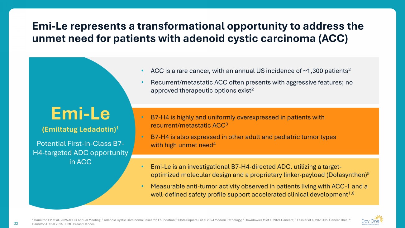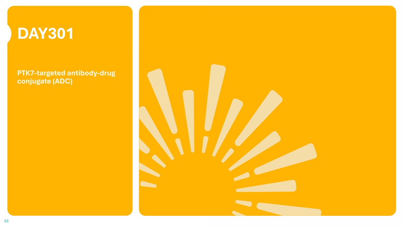 32 Emi - Le represents a transformational opportunity to address the unmet need for patients with adenoid cystic carcinoma (ACC) • ACC is a rare cancer, with an annual US incidence of ~1,300 patients 2 • Recurrent/metastatic ACC often presents with aggressive features; no approved therapeutic options exist 2 • B7 - H4 is highly and uniformly overexpressed in patients with recurrent/metastatic ACC 3 • B7 - H4 is also expressed in other adult and pediatric tumor types with high unmet need 4 • Emi - Le is an investigational B7 - H4 - directed ADC, utilizing a target - optimized molecular design and a proprietary linker - payload ( Dolasynthen ) 5 • Measurable anti - tumor activity observed in patients living with ACC - 1 and a well - defined safety profile support accelerated clinical development 1,6 Emi - Le ( Emiltatug Ledadotin ) 1 Potential First - in - Class B7 - H4 - targeted ADC opportunity in ACC 1 Hamilton EP et al. 2025 ASCO Annual Meeting; 2 Adenoid Cystic Carcinoma Research Foundation; 3 Mota Siquera J et al 2024 Modern Pathology; 4 Dawidowicz M et al 2024 Cancers; 5 Fessler et al 2023 Mol Cancer Ther ; 6 Hamilton E et al 2025 ESMO Breast Cancer.