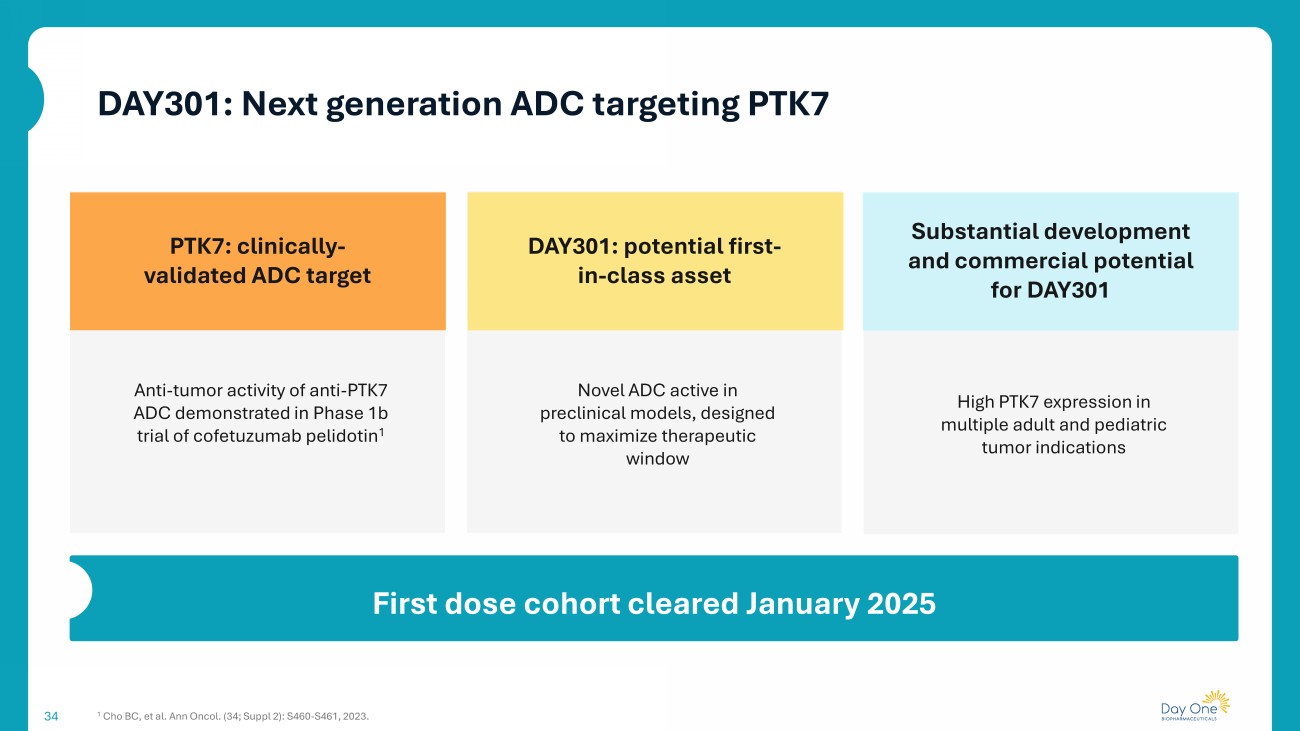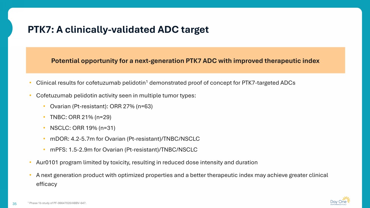 Substantial development and commercial potential for DAY301 Novel ADC active in preclinical models, designed to maximize therapeutic window 34 PTK7: clinically - validated ADC target Anti - tumor activity of anti - PTK7 ADC demonstrated in Phase 1b trial of cofetuzumab pelidotin 1 DAY301: potential first - in - class asset High PTK7 expression in multiple adult and pediatric tumor indications First dose cohort cleared January 2025 1 Cho BC, et al. Ann Oncol. (34; Suppl 2): S460 - S461, 2023. DAY301: Next generation ADC targeting PTK7