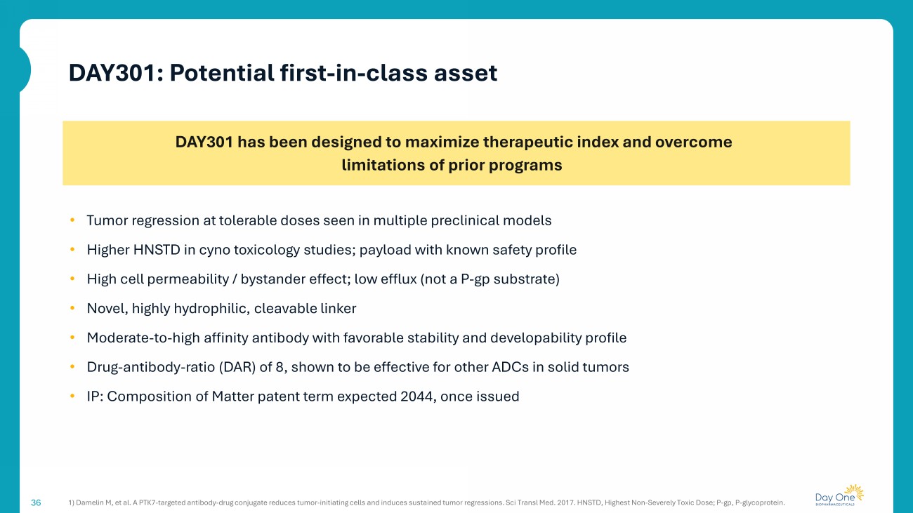 36 DAY301 has been designed to maximize therapeutic index and overcome limitations of prior programs • Tumor regression at tolerable doses seen in multiple preclinical models • Higher HNSTD in cyno toxicology studies; payload with known safety profile • High cell permeability / bystander effect; low efflux (not a P - gp substrate) • Novel, highly hydrophilic, cleavable linker • Moderate - to - high affinity antibody with favorable stability and developability profile • Drug - antibody - ratio (DAR) of 8, shown to be effective for other ADCs in solid tumors • IP: Composition of Matter patent term expected 2044, once issued 1) Damelin M, et al. A PTK7 - targeted antibody - drug conjugate reduces tumor - initiating cells and induces sustained tumor regressions. Sci Transl Med. 2017. HNSTD, Highest Non - Severely Toxic Dose; P - gp , P - glycoprotein. DAY301: Potential first - in - class asset