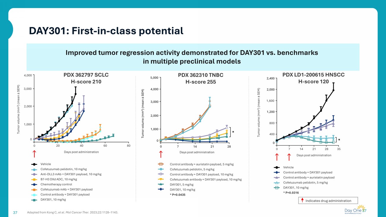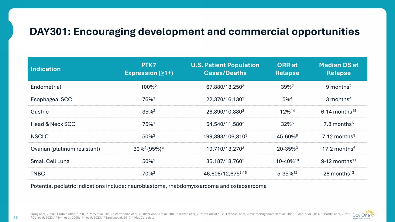 37 37 Improved tumor regression activity demonstrated for DAY301 vs. benchmarks in multiple preclinical models DAY301: First - in - class potential PDX LD1 - 200615 HNSCC H - score 120 Vehicle Control antibody + DAY301 payload Control antibody + auristatin payload Cofetuzumab pelidotin , 5 mg/kg DAY301, 10 mg/kg * P=0.0316 Days post administration * 0 7 14 21 28 35 Tumor volume (mm 3 ) (mean “ SEM) 2,400 0 2,000 1,600 1,200 800 400 Control antibody + auristatin payload, 5 mg/kg Cofetuzumab pelidotin , 5 mg/kg Control antibody + DAY301 payload, 10 mg/kg Cofetuzumab antibody + DAY301 payload, 10 mg/kg DAY301, 5 mg/kg DAY301, 10 mg/kg * P=0.0435 0 PDX 362310 TNBC H - score 255 4,000 3,000 2,000 1,000 0 7 14 21 28 * Days post administration Tumor volume (mm 3 ) (mean “ SEM) 0 Vehicle Cofetuzumab pelidotin , 10 mg/kg Anti - DLL3 mAb + DAY301 payload, 10 mg/kg B7 - H3 DXd ADC, 10 mg/kg Chemotherapy control Cofetuzumab mAb + DAY301 payload Control antibody + DAY301 payload DAY301, 10 mg/kg 20 40 60 80 0 3,000 2,000 1,000 Days post administration PDX 362797 SCLC H - score 210 Tumor volume (mm 3 ) (mean “ SEM) Adapted from Kong C, et al. Mol Cancer Ther. 2023;22:1128 – 1143. Indicates drug administration 4,000 5,000