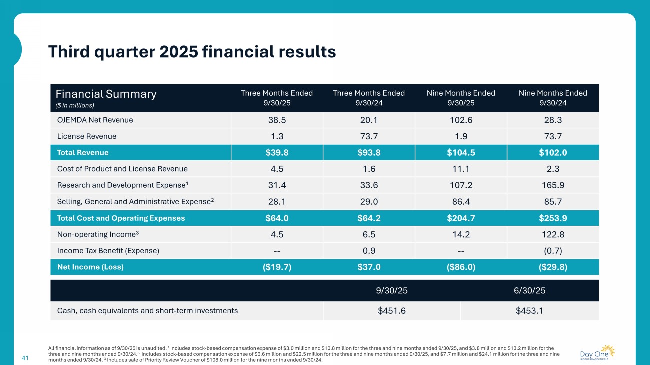 41 Third quarter 2025 financial results All financial information as of 9/30/25 is unaudited. 1 Includes stock - based compensation expense of $3.0 million and $10.8 million for the three and nine months ended 9/30/25, and $3. 8 million and $13.2 million for the three and nine months ended 9/30/24. 2 Includes stock - based compensation expense of $6.6 million and $22.5 million for the three and nine months ended 9/30/25, and $7 .7 million and $24.1 million for the three and nine months ended 9/30/24. 3 Includes sale of Priority Review Voucher of $108.0 million for the nine months ended 9/30/24. Nine Months Ended 9/30/24 Nine Months Ended 9/30/25 Three Months Ended 9/30/24 Three Months Ended 9/30/25 Financial Summary ($ in millions) 28.3 102.6 20.1 38.5 OJEMDA Net Revenue 73.7 1.9 73.7 1.3 License Revenue $102.0 $104.5 $93.8 $39.8 Total Revenue 2.3 11.1 1.6 4.5 Cost of Product and License Revenue 165.9 107.2 33.6 31.4 Research and Development Expense 1 85.7 86.4 29.0 28.1 Selling, General and Administrative Expense 2 $253.9 $204.7 $64.2 $64.0 Total Cost and Operating Expenses 122.8 14.2 6.5 4.5 Non - operating Income 3 (0.7) -- 0.9 -- Income Tax Benefit (Expense) ($29.8) ($86.0) $37.0 ($19.7) Net Income (Loss) 6/30/25 9/30/25 $453.1 $451.6 Cash, cash equivalents and short - term investments