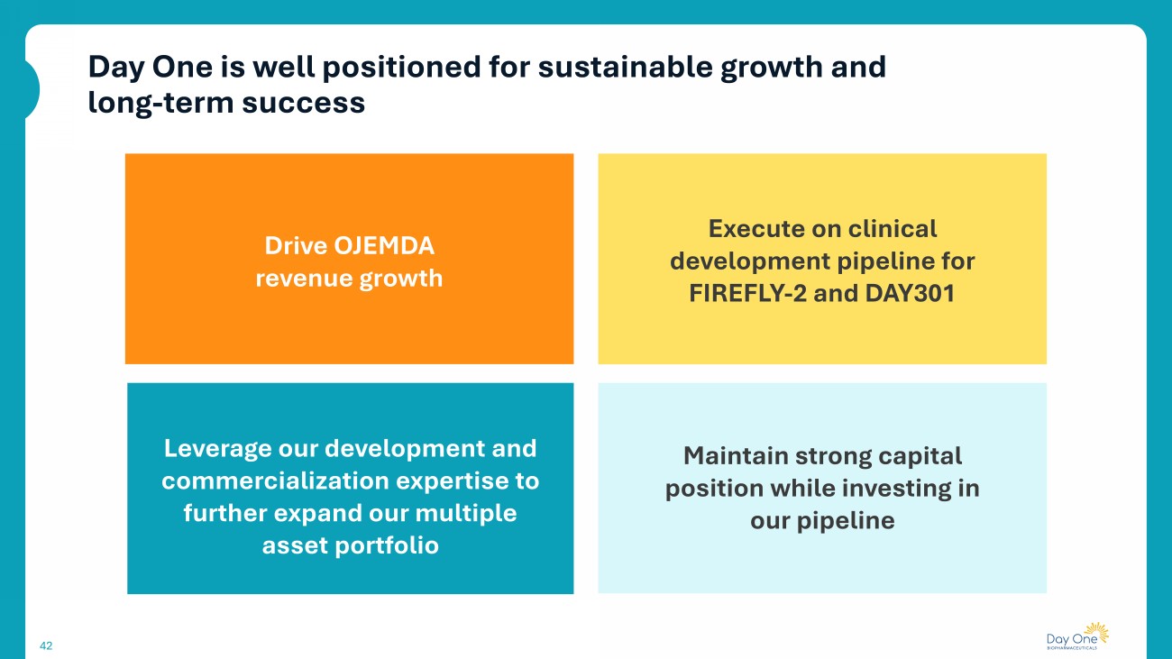 42 Day One is well positioned for sustainable growth and long - term success 42 Drive OJEMDA revenue growth Execute on clinical development pipeline for FIREFLY - 2 and DAY301 Leverage our development and commercialization expertise to further expand our multiple asset portfolio Maintain strong capital position while investing in our pipeline