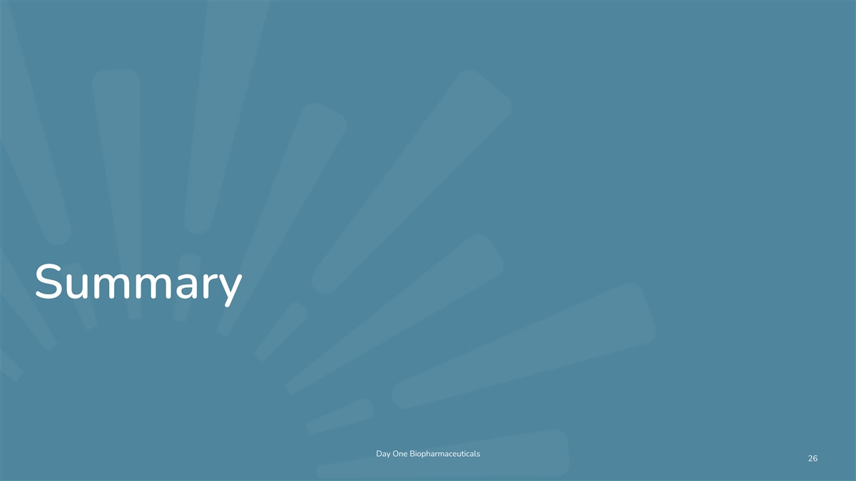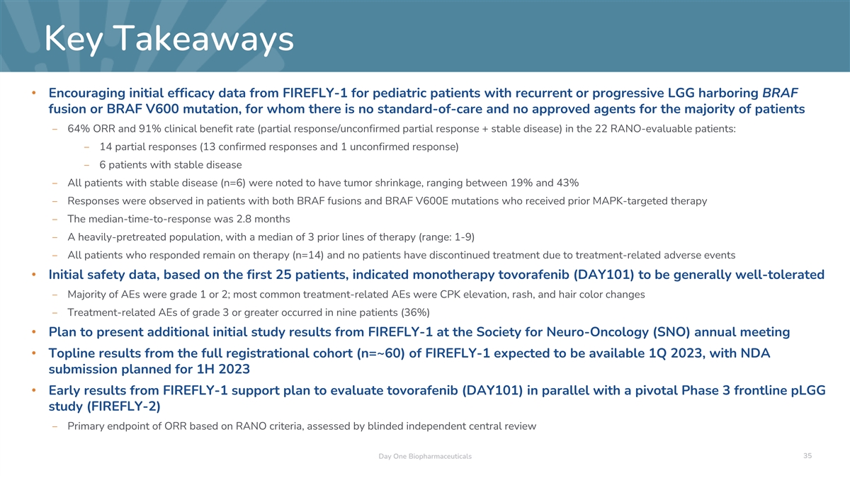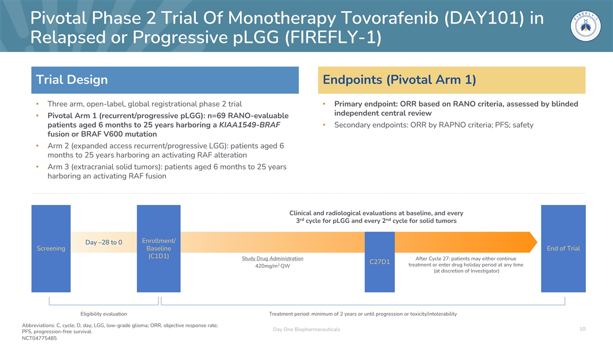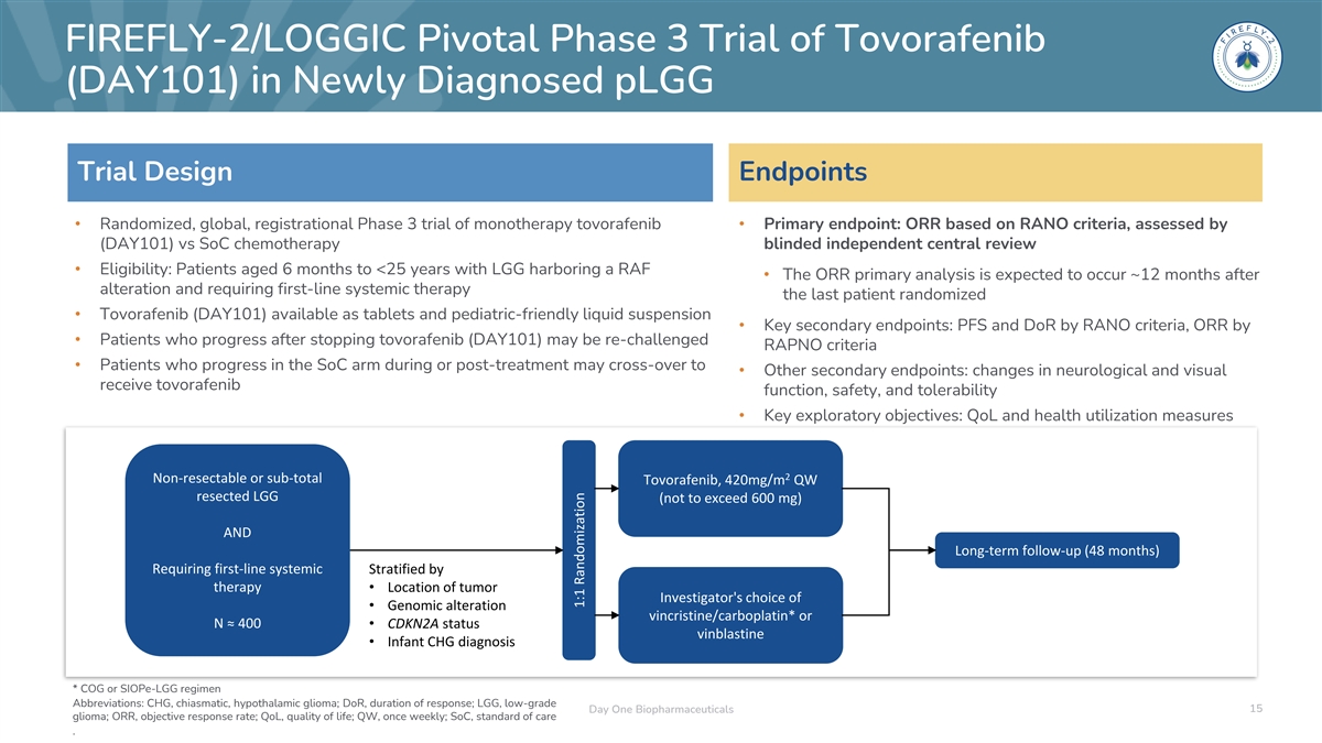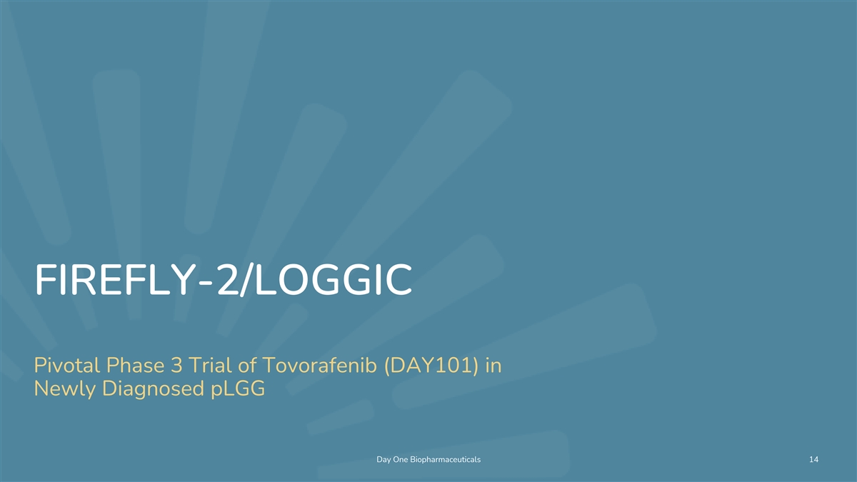 FIREFLY-2/LOGGIC Pivotal Phase 3 Trial of Tovorafenib (DAY101) in Newly Diagnosed pLGG Day One Biopharmaceuticals 14