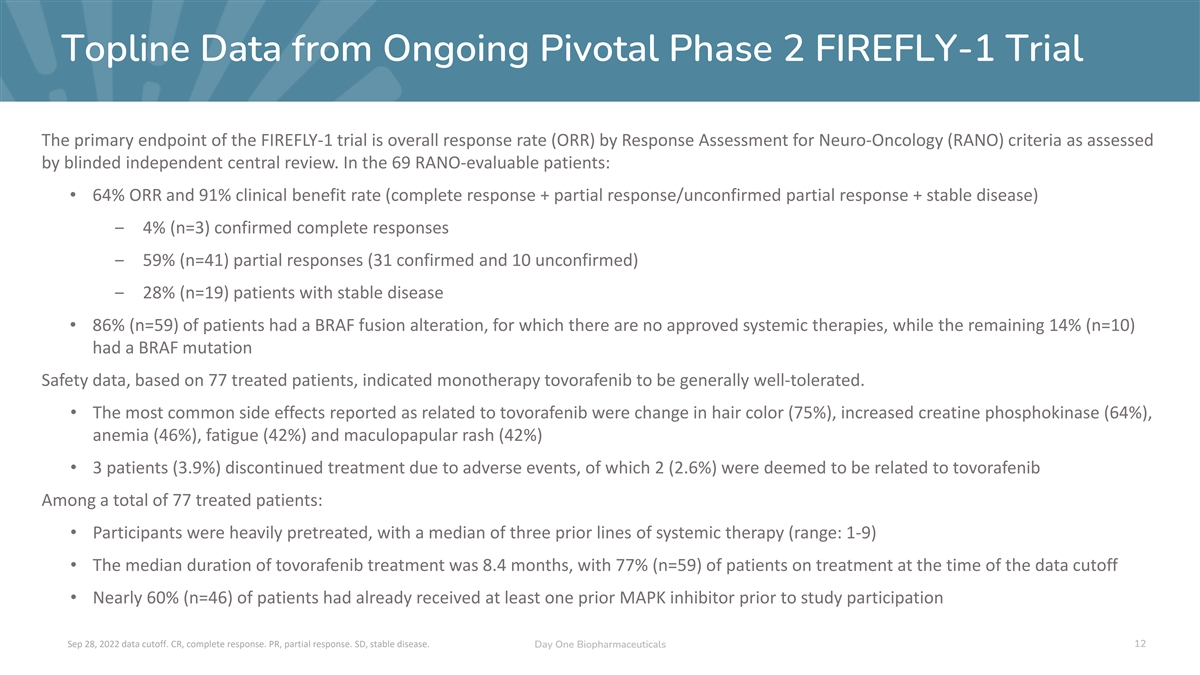 FIREFLY-1 Baseline Patient Characteristics Location (n=77) Cerebral hemisphere Deep midline structures 8% 12% Topline Data Characteristic Arm 1 (N=77) Other 16% Median age, years (range) 8 (2-21) BRAF alteration, n (%) Optic pathway Cerebellum 51% BRAF V600E 13 (17) 6% † BRAF Fusion 64 (83) Brain stem 8% Median number of lines of prior therapy (range) 3 (1-9) BRAF alteration (n=77) Prior MAPK pathway targeted therapy, n (%) BRAF V600E Yes 46 (60) 17% No 31 (40) Geography, n (%) U.S. 27 (35) † BRAF fusion Ex-U.S. 50 (65) 83% Sep 28, 2022 data cutoff. †Includes 8 patients with BRAF duplication or BRAF rearrangement. MAPK, mitogen-activated protein kinase; prior MAPK pathway targeted therapy indicates either prior MEKi and/or prior type I RAFi therapy. Day One Biopharmaceuticals 11