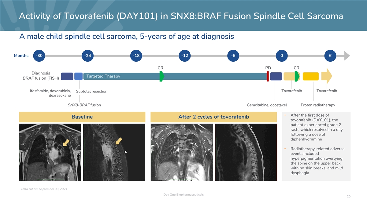 Activity of Tovorafenib (DAY101) in SNX8:BRAF Fusion Spindle Cell Sarcoma A male child spindle cell sarcoma, 5-years of age at diagnosis Months -30 -24 -18 -12 -6 0 6 CR PD CR Diagnosis Targeted Therapy BRAF fusion (FISH) Ifosfamide, doxorubicin, Tovorafenib Tovorafenib Subtotal resection dexrazoxane SNX8-BRAF fusion Gemcitabine, docetaxel Proton radiotherapy • After the first dose of Baseline After 2 cycles of tovorafenib tovorafenib (DAY101), the patient experienced grade 2 rash, which resolved in a day following a dose of diphenhydramine • Radiotherapy-related adverse events included hyperpigmentation overlying the spine on the upper back with no skin breaks, and mild dysphagia Data cut off: September 30, 2021 Day One Biopharmaceuticals 20